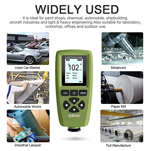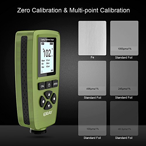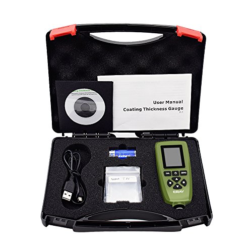 Fe/NFe Dual Probe: The measuring range of this paint thickness gauge is 0 to 2000um(78.7mils). 4 general groups can store max. 320 readings when power off, 80 readings per groupCoating Thickness Gauge: Human-oriented interface with backlight LCD dispaly, user can set the parameters visually before using it. And easy to store, recall or delete the readingsCD & USB Cable: User can view and analyze the measurement via USB interface to data transmission after installing the software in CD to PC. Low battery and error indicationALARM Function: ERAY paint thickness meter is better for special security requirements, user can set high or low limit alarm, alarm icon displayed on LCD when over the limitWidely Used: This coating thickness meter is suitable for laboratory, workshop, paint shops, automobile, shipbuilding, aircraft industries, etc. 24 months free replacement