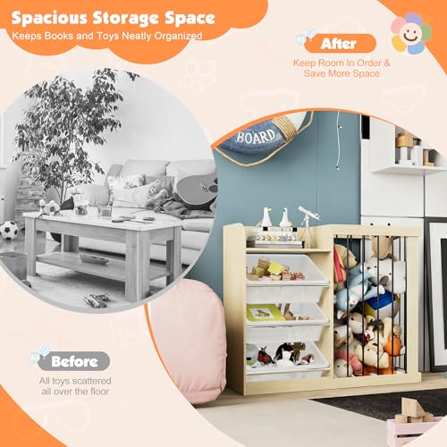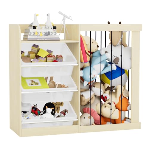 3-in-1 Design: Combining a toy organizer, kids bookshelf, and stuffed animal storage in one unit, this multi-functional kids storage organizer keeps toys, books, and décor items well organized. The toy chest storage helps children build independence through tidy play and reading spaces.Kid-Friendly Height: Standing at 31.6" tall, it’s designed at the right height for toddlers to children to reach their toys safely. The stable structure ensures durability and balance, even when fully loaded with books and toys.Durable Bins: Made of high-quality PP material, the three removable white bins are sturdy, lightweight, and easy to clean. Each bin slides out smoothly, helping kids pick up and put away their essentials with ease while learning good organization habits.Elastic Storage: The side compartment of toy organizer with elastic ropes is perfect for storing plush toys, balls, or other large children’s items. Its flexible design keeps everything visible and easy to grab while maintaining a neat, tidy look.Warm Burlywood: Featuring a natural Burlywood tone and smooth rounded edges, this toy shelf matches any home décor. Ideal for playrooms, nurseries, bedrooms, or living rooms, it adds a simple yet elegant touch to every corner.