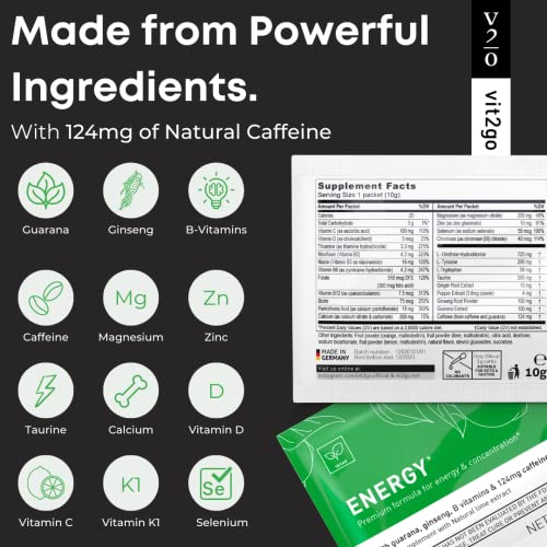 Sustained Natural Energy, No Crash: Get a smooth, long-lasting boost with 124mg of plant-powered caffeine from Guarana & Ginseng. Say goodbye to the jitters and afternoon slump you get from coffee or sugary energy drinks.Fuel Your Body with Essential Nutrients: More than just caffeine, our formula includes Magnesium for muscle function, Zinc for immune support, and B-Vitamins to enhance energy metabolism and mental focus - providing complete nutritional support in every sip.Zero Sugar, Zero Guilt, All Energy: Our sugar-free formula is keto-friendly and made with clean, non-GMO ingredients. Enjoy a guilt-free energy boost without artificial colors, sweeteners, or preservatives.Perfect for Pre-Workout or On-the-Go Boost: Whether you're hitting the gym, powering through a long workday, or traveling, our convenient, single-serve sachets mix instantly in water for a clean energy lift anytime, anywhere.Clean, Transparent Formula You Can Trust: Made with non-GMO ingredients and vegan-friendly. Our formula is also free from artificial colors or preservatives and is third-party tested for purity and potency.