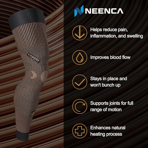 UPGRADED DESIGN— Adopt the Anti-Inflammatory Therapy, medical leg sleeve with no allergies and itchiness. Help provide relief from ailments such as Calf Pain, Shin Splints, Leg Cramping, Muscle Soreness, Fatigue, swelling, POTS, arthritis, tendonitis, joint inflammation, jumper's knee, varicose & spider veins. With high-elastic tight and breathable compression fabric, GREAT for pain relief and recovery.BETTER PERFORMANCE— Innovative functional fabric will keep your leg warm and reduce stiffness, reducing inflammation and swelling, increase oxygen flow. So it will prevent potential sports injuries without sacrificing your performance! Non-slip gel dots and high-elastic copper ions fabric to avoid slide or roll during exercise, compression knee sleeve can be worn day and night for 24/7 recovery, It will stay in place all day!TARGETED PAIN RELIEF— It works by applying even compression to your body, which help joint and knee pain relief and faster recovery after intense workouts or injuries, scientifically proven to increase blood flow and optimize the body's healing process. Wrap around Patella to enhance the stability of kneecap and relax tendons, prevent muscle strain. Relieve ACL, MCL, PCL pain, prevent ligament injury, meniscus tear, swelling, inflammation and so on. It is Perfect for Pain Recovery or Workout!COMFORT— NEENCA got a well balance between compression and comfort. Keep Your Knees, Thighs, Quads, Hamstrings, Calves, Legs, and Joints Compressed with our comfortable Ultra Copper Infused fabric that gives you great compression while still allowing you to retain your range of motion. Moisture wicking technology keeps you dry and helps prevent rashes and itchiness. With our high Copper ions bound in the fibers, this will also help reduce odors.MULTIFUNCTION— Ideal for high performance training, sports & exercise, NEENCA copper leg sleeve is worn by competitive and recreational athletes during and after activity to optimize performance and help prevent potential injury. Long copper knee sleeve for meniscus tear, arthritis, ACL, joint pain relief, sports injury recovery. Widely used in many sports such as basketball, running, cycling, volleyball, gym, tennis, hiking, workout and more, durable enough so you can wear it all day long!