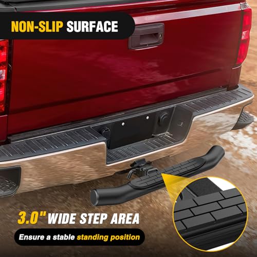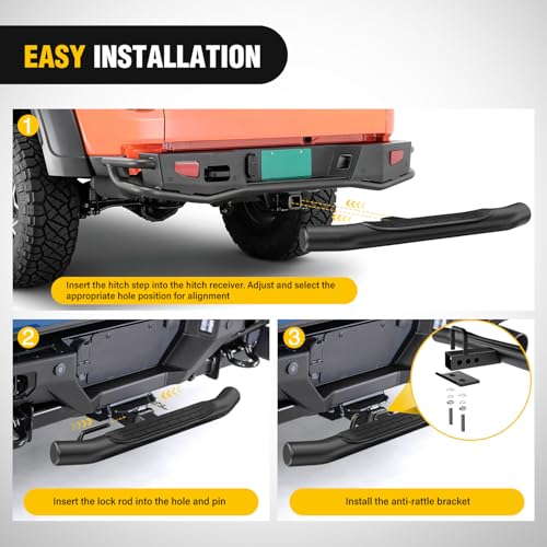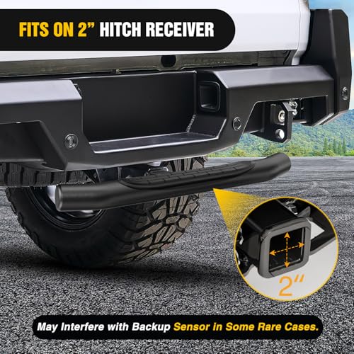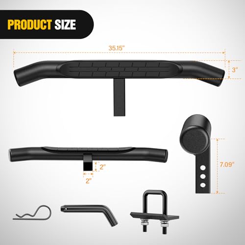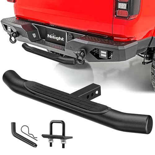 【Universal Size】- Nilight Hitch Step is a multipurpose solution designed to fit universally with all 2-inch trailer hitches, seamlessly integrating with pickup trucks, SUVs, vans, and off-road vehicles.【Sturdy and Durable】- Constructed with high-quality materials, it exhibits excellent durability and a long lifespan, capable of withstanding various conditions. Maximum weight capacity is 350 pounds.【Classic Style】- The 3" round tube pole is curved at both ends and covered with a tough rust-resistant coating, and topped with non-slip feet. Durable and beautiful.【Easy to install】- No drilling required. Easy plug in installation.It not only makes your vehicle look tougher but it also protects your vehicle from rear end collisions.【Package Included】- 1 x Hitch Step, 1 x 5/8”Hitch Pin and 1 x U-Bolts. If you have any questions or problems, please contact us.