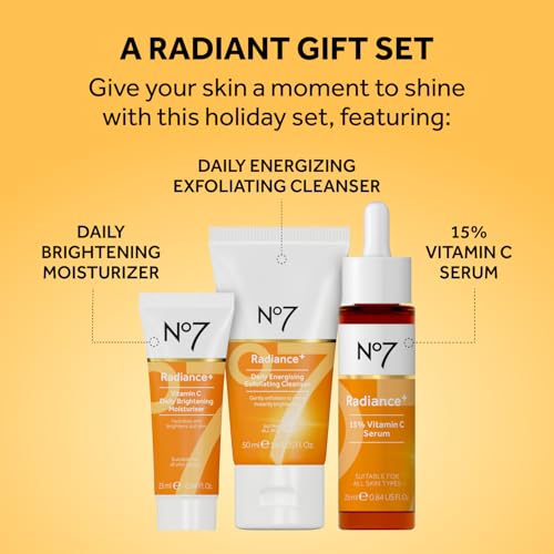 Radiant Treatment - This 3-piece skin care gift set includes the Radiance+ Vitamin C Facial Moisturizer, 15% Vitamin C Face Serum, and Exfoliating Facial Cleanser, carefully selected to energize and brighten skin.Radiance+ Exfoliating Cleanser - A gentle exfoliating face cleanser that helps scrub away dead skin cells, remove daily impurities, and reveal a smoother, brighter complexion with every wash.Radiance+ 15% Serum - This powerful facial serum delivers a high concentration of Vitamin C to help improve skin tone, reduce dullness, and promote a more radiant, energized appearance.Radiance+ Brightening Moisturizer - A fast-absorbing, lightweight face cream that hydrates while helping to visibly brighten skin and enhance your natural glow throughout the day.Empowering Women Since 1935 - No7 has been creating beauty history by helping women look and feel their best for decades. With our rich health and beauty heritage, innovative skincare, and makeup backed by science, we've become the trusted brand through the generations. No7 has always offered every woman luxurious and glamorous beauty at a price they can afford.