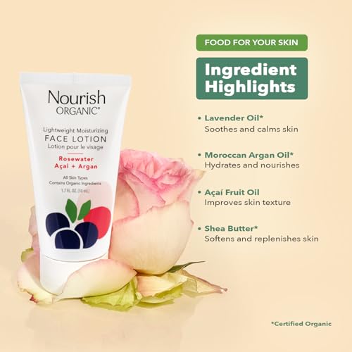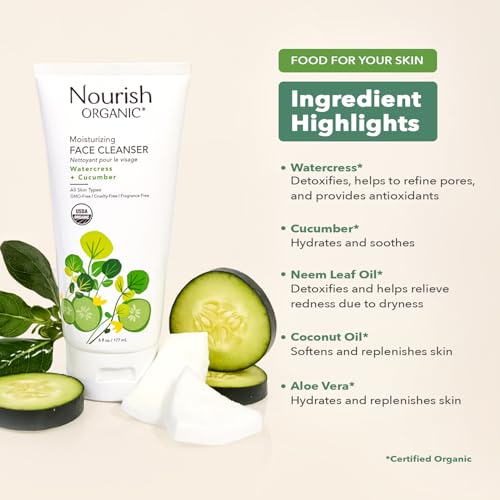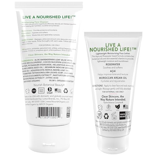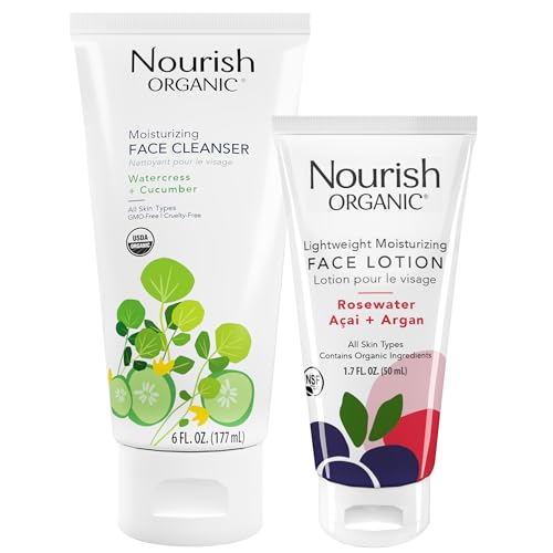 FACE CARE SET FOR WOMEN & MEN: The Watercress + Cucumber Face Cleanser (6 oz) and Rosewater Açai + Argan Face Lotion (1.7 oz), formulated with certified organic ingredients, are the perfect duo for all skin types.GENTLE FACE WASH: The soothing facial cleanser, with organic aloe vera juice as the first ingredient, refreshes and hydrates skin while clearing your pores.LIGHTWEIGHT FACE CREAM: The non-greasy facial lotion, infused with rosewater, lavender oil, and orange oil, leaves your skin soft, supple, and nourished.CONTAINS ORGANIC INGREDIENTS: Our cruelty-free, vegan skincare products are free from propylene glycol, sulfates, synthetic dyes, parabens, mineral oils, phthalates, silicones, and petrochemicals.LIVE A NOURISHED LIFE: At Nourish Organic, we believe skincare ingredients should be food for your skin vs. cosmetics for your skin.