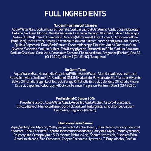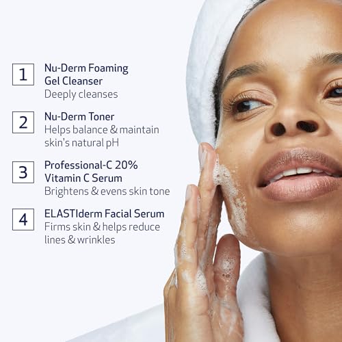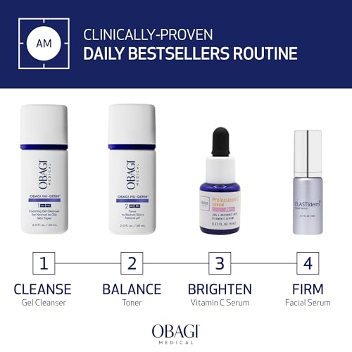 4-Step Daily Skincare Routine: Discover Obagi’s bestselling skincare products with this medical-grade set, featuring 4 clinically proven products: Nu-Derm Foaming Gel Cleanser, Nu-Derm Face Toner, Professional-C 20% Vitamin C Serum, and ELASTIderm Facial Serum; suitable for all skin types, this comprehensive set comes in travel-friendly sizes and makes for an ideal gift for any occasion – from birthdays to holidaysCleanse & Tone Pores: Remove makeup and everyday impurities for a clean, fresh-looking complexion with Nu-Derm Foaming Gel Cleanser, then balance and help maintain your skin’s natural pH with the non-drying Nu-Derm TonerBrighten & Firm Skin: Revitalize & even skin tone with Professional-C 20% Vitamin C Serum, then finish the daily routine with ELASTIderm Facial Serum to support skin elasticity & promote firmer, more resilient-looking skinDermatologist Tested, Physician Endorsed: Our portfolio of products are dermatologist tested and physician endorsed; that’s why professionals trust us to provide superior skincare for their patients35 Years of Transformational Skincare: From being the first to clinically test our products on all skin types & tones, to setting the standard for medical-grade skincare, we’re proud to bring you effective & transformative solutions for every step of your skincare journey