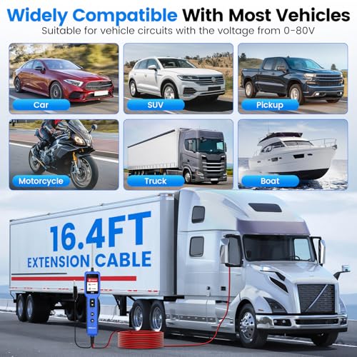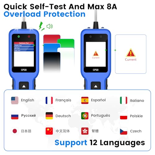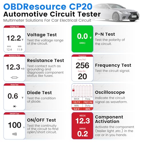 【Four-in-One Power Circuit Diagnostic Tool】The OBDResource CP20 Circuit Tester integrates a digital multimeter, digital oscilloscope, 汽车用品 circuit testing, and component activation functions into one portable smart electrical system testing device. Enhanced protection mechanisms guard against reverse polarity on input signal lines, excessive input voltage, and overloaded current, ensuring safer and more convenient operation.【Simple and Intuitive Interface】The CP20 汽车用品 power circuit probe tester supports full-vehicle electrical system testing from 0–80V. After powering on, it cycles between two advanced modes: ① Multimeter and oscilloscope combination mode, ② Component activation mode. Equipped with a 2.4-inch high-definition color screen, LED indicators, a buzzer, and high-sensitivity probes, test processes and results are displayed in real-time on the TFT screen for clear and intuitive visualization.【Multimeter + Oscilloscope Mode】In multimeter mode, this tester supports six functions: voltage, resistance, diode, continuity (ON/OFF), polarity (P-N), and frequency testing. It can read maximum/minimum voltage, frequency, and duty cycle. Oscilloscope mode provides five signal monitoring functions: camshaft, crankshaft, injector, throttle signal, and CAN bus polarity detection.【Component Activation + Dual Protection】The ECT300 tester activates 汽车用品 components via probes to verify operation of lights, motors, wipers, cooling fans, relays, injectors, and more. Its dual protection system guards against overcurrent and overheating with millisecond response times, effectively preventing short-circuit damage.【Multi-Language · Long Cable · After-Sales Support】This tool supports 12 languages (including English, German, French, Japanese, etc.), features a 16-foot cable with LED illumination and audible alarm, and is compatible with 0–80V vehicle electrical systems. Suitable for cars, trucks, boats, excavators, motorcycles, and more, it's widely used in repair shops, education, home, and industrial settings. The product comes with a 1-year warranty and a 30-day no-questions-asked return policy.