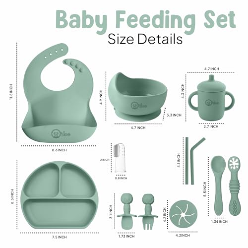 O'doe 11-Piece BPA-Free Silicone Baby Feeding Set , Thick & Soft Suction Plates, Baby Bowls, Wooden Fork & Spoon, and More , Make Mealtime Fun and Easy for Your Little One (Green, V1)