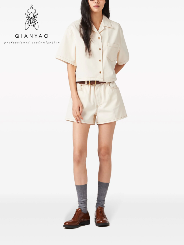 OEM Custom Waist Ruffled Edge Color Contrast Stitching Denim Shorts for Women