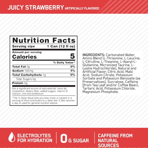 Energy + Hydration: A refreshing blend of 100mg of caffeine from natural sources plus electrolytes for hydrationZERO sugar and LOW calorie. Only 5 calories per serving5 grams of amino acids per serving for recoveryOn-the-go and lightly carbonated sparkling hydration energy drink; 8 refreshing flavors: Blueberry Lemonade, Juicy Strawberry, Watermelon, Grape, Juicy Cherry, Mango Pineapple Limeade, Orange Blast, and Peach BelliniIt’s everything you need to show up for what matters to you