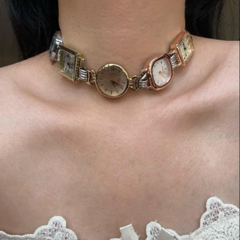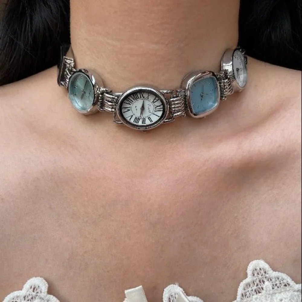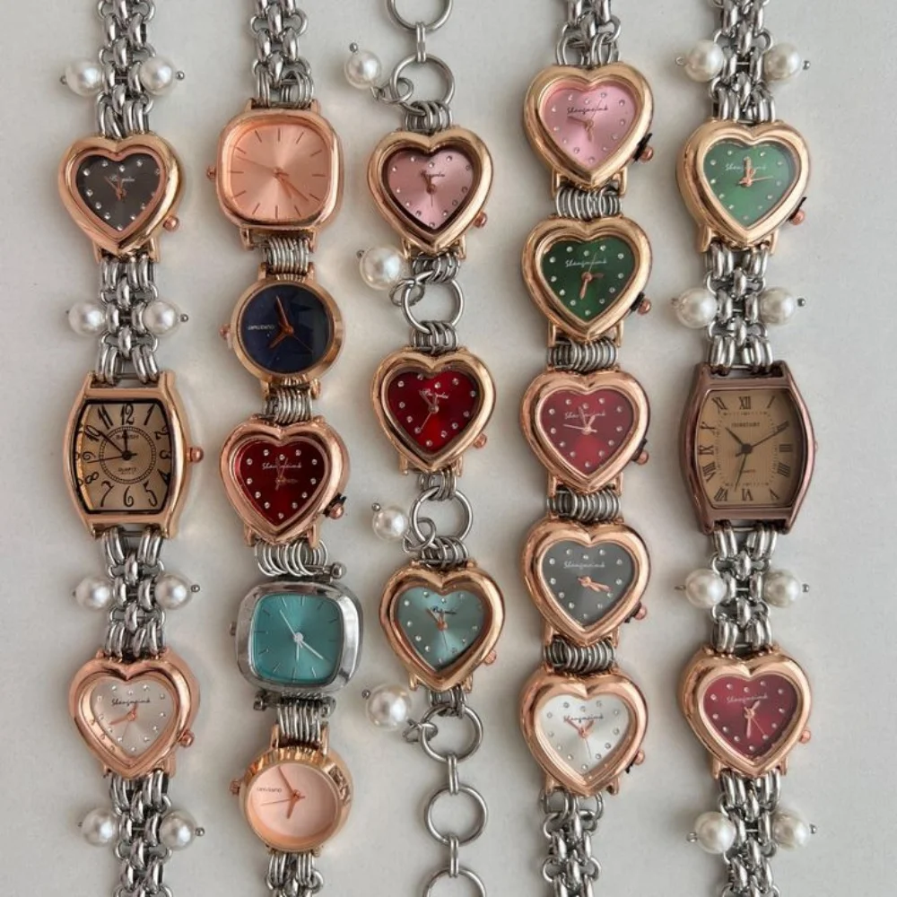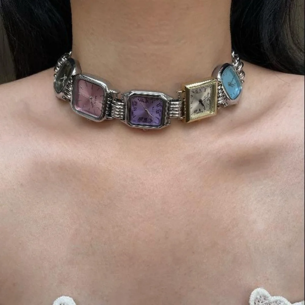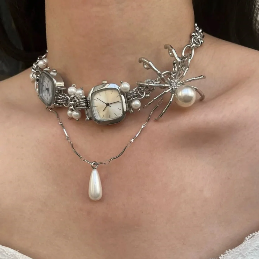 ♡ Made with stainless steel chain + a combination of cubic zirconia, rhodium, and stainless steel pendants.♡ Battery powered watch face battery included.♡ Due to the handmade nature of this item, some charms may vary.