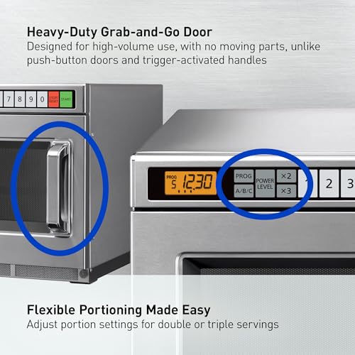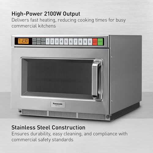 Powerful & Compact: 2100W commercial microwave with a small footprint; fits easily on countertops while delivering fast, reliable cooking; ideal for restaurants, catering, cafés, convenience stores, and more; holds one half-size 6” tall pan with coverEven, Consistent Cooking: Using top-and-bottom energy with five-stage cooking ensure perfectly heated meals every time; ideal for scrambled eggs, frittatas, salmon, shrimp, chicken, potatoes, pasta, and vegetables; effortless cooking with great resultsFast & Easy to Use: Takes the guesswork out of cooking with 30 programmable menus, 15 power levels, and portion settings for x2 and x3 servings; makes food service quicker, easier, and more efficient; 2100 watts of power ensures fast, thorough heatingSimple to Clean: Stainless steel interior with a removable ceiling plate for quick cleaning; great for high-use environments such as gas stations, convenience stores, and restaurantsMade for Busy Kitchens: Built tough to stand up to high-volume use, with durable grab-and-go door that withstands up to 4K open/close cycles; NSF and UL commercial approval; 1-year warranty