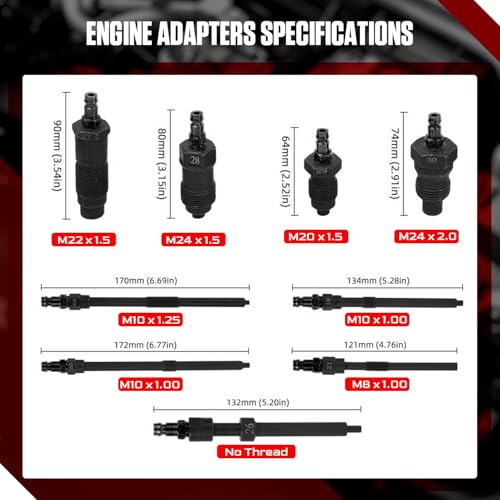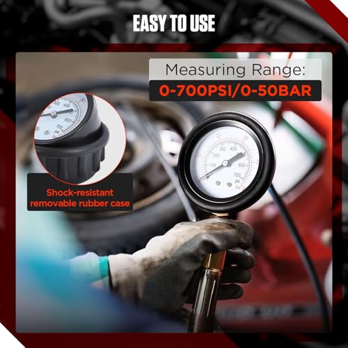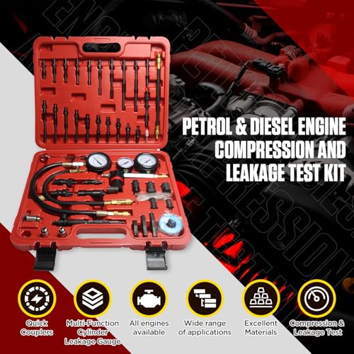 ??【Comprehensive Engine Testing】Angchun Compression and leakage tester kit is suitable for most petrol and modern diesel engines, including HDi, TDCi, and Pumpe Duse, this kit allows for both compression and leak-down testing, ensuring thorough diagnostics for a wide range of vehicles??【High-Pressure Capabilities】The petrol & diesel engine compression tester features a compression gauge that can measure up to 50 bar (725 psi) and includes a liquid-filled gauge for precise readings, making it ideal for high-performance and heavy-duty engines??【Versatile Adapter Range】Engine compression gauges test kit comes with a variety of glow plug, injector, and spark plug adapters to fit Alfa, BMW, Chrysler, Daewoo, Ford, Mercedes-Benz, Nissan, Toyota, and many more. This ensures compatibility with numerous makes and models, covering cars, trucks, buses, agricultural, and marine engines??【Durable Construction】47-piece engine compression tester kit built with high-quality materials such as chrome vanadium steel, this compression tester kit is designed to withstand rigorous use in professional workshop environments. The gauges are also protected with rubber bumpers for added durability??【Quick and Easy Connections】Angchun compression tester 汽车用品 includes straight and angled quick couplers for efficient setup and operation, minimizing downtime and improving workflow in busy workshops