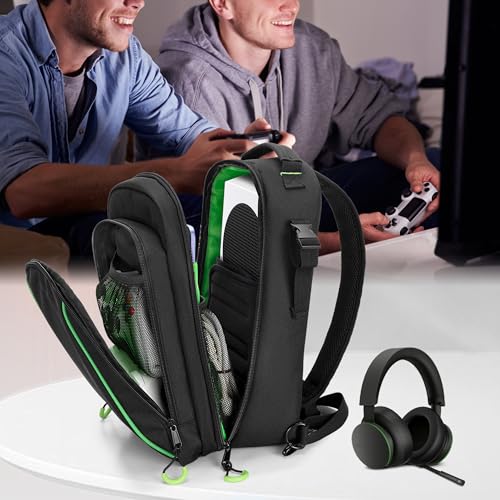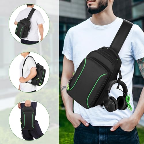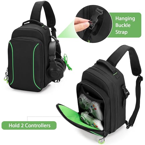 Compatible With: This sling bag is specially designed to compatible with Xbox Series S* console (Our product is unrelated to brand mentioned); The main compartment is equipped with thick padding, and a wide fixing strap to keep your console in place; Ensure console away from impacts and bumpsThoughtful Design: Smooth double zipper & large opening is easy to open and close; Metal shoulder strap clasp is strong and lasting; Also, this travel bag is made of sturdy and robust nylon, ensuring a long-lasting performanceExtra Storage Room: The main compartment has an inner mesh pocket and padded sleeve to hold cables, Pad; Front zipper pocket can keep 2 controllers, and side buckle strap can hang your headset or cap; Back anti-thief pocket is suitable for storing keys, wallet, cell phoneLightweight & Compact: With a portable and compact size, detachable shoulder strap, simple handle, our travel case is convenient for you to carry on the goAwesome Case: The carrying case is small and stylish, it is great for taking your system and accessories with you from the house to friend's or maybe for a flight