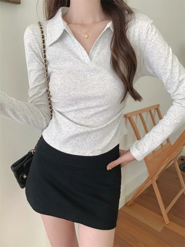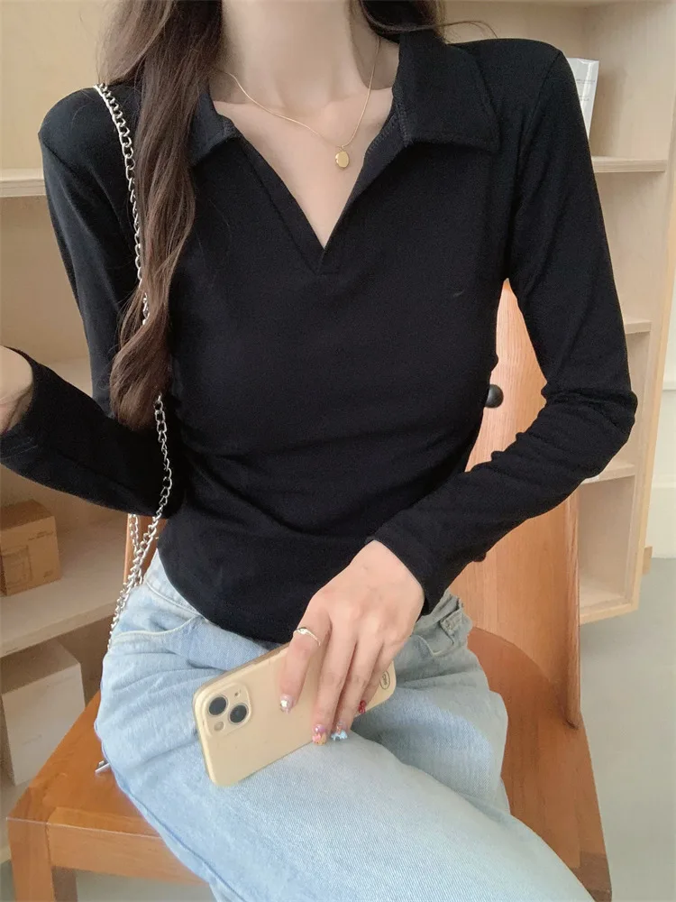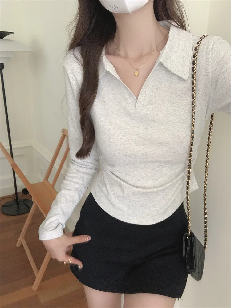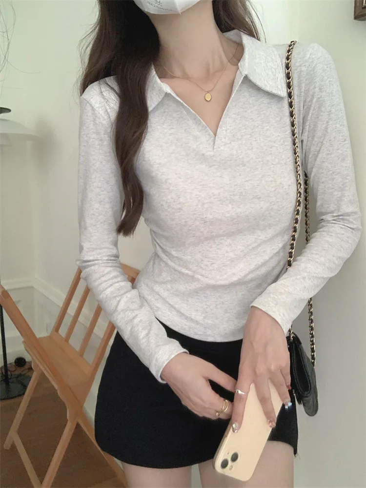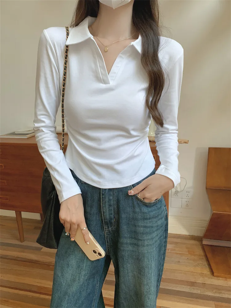 POLO Collar Long-Sleeve T-Shirt Women's Slim-Fit Hem Breathable, Soft Long-Sleeve Cotton