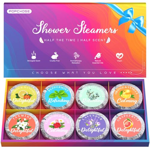 PERFECT GIFTS OPTIONS -- These shower steamers make perfect gifts for a variety of occasions, including Mother's Day, Father's Day, Halloween, Thanksgiving, Christmas, weddings, and anniversaries. They are especially ideal as self-care and spa gifts for women, men, moms, dads, and loved ones, stocking stuffers for women, men, teen girls. Thoughtfully designed for relaxation, they are excellent for expressing appreciation and providing a luxurious, aromatic experienceINDIVIDUALLY GIFT PACKAGED -- Each shower steamer is individually packaged, making them ideal for creating a DIY home spa kit. They can be easily split for immediate use while preserving the rest, providing exceptional practicality and care. These eco-friendly shower steamers minimize waste and offer the value of 16 showers in an 8-pack, making them perfect relaxing gifts for women, as well as thoughtful anniversary and Valentine's Day gifts for adults. Mens stocking stuffers, christmas stocking stuffers, stocking stuffers adults, men stocking stuffers, womens stocking stuffers, stocking stuffers for girls, mens stocking stuffers 2025, stocking stuffers for teens, adultsAROMATHERAPY FOR RELAXATION -- Discover the ultimate relaxation experience with our Variety Pack of 8 Scents Shower Steamers. Each steamer is infused with 100% natural and organic aromas sourced from fresh plants and fruits, including soothing Lavender, fragrant Jasmine, zesty Lemon & Mandarin, and more. This an unique and popular relaxing gifts, gifts for women, birthday gifts for women, christmas gifts for women, gifts for women readers, personalized gifts for women, anniversary gifts for women, womens gifts, self care gifts for women, gift baskets for women, small gifts for women, unique gifts for womenNATURAL ESSENTIAL OILS -- POPCHOSE shower tablets are infused with double the amount of natural essential oils, providing a captivating fragrance that endures throughout your shower. Designed to avoid melting too quickly or leaving residue, they ensure a silky fizz and a delightful aroma. Perfect for various occasions such as valentine's Day, birthdays, christmas, easter, or as spa gifts for women, friendship gifts for women, best friend birthday gifts for women, get well gifts for women, gift set for women, gifts for women who have everything, bulk gifts for women, best friend gifts for women. These shower steamers make excellent gifts for any special woman in your lifeSELF CARE & HOME SPA-- Transform your bathroom into a serene and aromatic haven with these shower steamers, perfect for daily relaxation and rejuvenation. Ideal as home spa gifts for women and moms, these aromatherapy stocking stuffers promote well-being through tranquil moments. They make excellent gifts for various occasions, including Valentine's Day, birthdays, Christmas, Easter, and as spa gifts for women. Whether you're looking for stocking stuffers for adults, gifts for mom, or unique presents for women, these shower steamers offer a luxurious and soothing experience