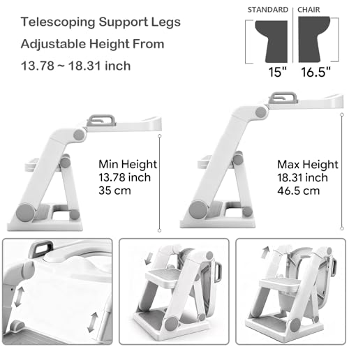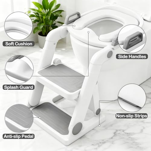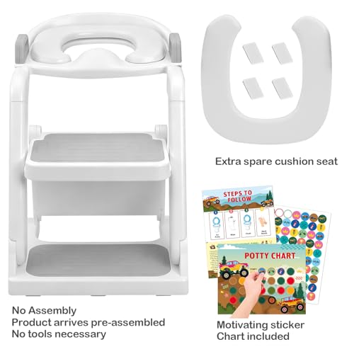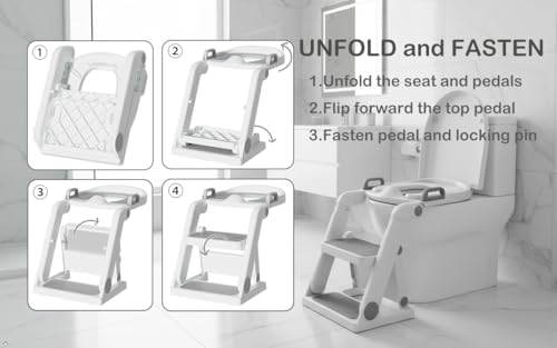 No Assembly & Folds Compactly: Our newest no assembly required potty training seat with step stool ladder is designed for convenience and space-saving. It comes pre-assembled so there’s no hassle with that, just unfold the potty chair and fold down small for easy storage, no need to screw and perfectly for small space.Safety First & Upgraded Stability: Considering the stability, the toddler toilet seat attachment is designed with as few components as possible and pre-secured with metal screws. Non-slip strips on the bottom help keep the step ladder steady on the floor. Slip-resistant pedal and sturdy handles help kids climb up securely.Adjustable Height & Sturdy Construction: This sturdy triangular structure toddler toilet seat with steps holds up to 120 Lbs. The support legs are telescoping for adjusting height (14~18 inch) to fit toilets, including standard height (15”) and chair height (16.5”), round or elongated bowl design toilets.Soft Cushion & Splash Guard: The toddler potty seat comes with a soft, removable and washable PVC cushion which make it comfortable for the baby kid boys and girls. The downward-extending splash guard on the potty training seat fits snugly around the toilet rim and keeps potty time clean.Confident & Independent Potty Training: This new design, stable, non-slip and safe kids-friendly 2-in-1 potty training toilet seat with step ladder combines a toddler toilet seat with a sturdy, easy-to-climb toilet step ladder, which helps children to learn and use the toilet independently and feel confident.