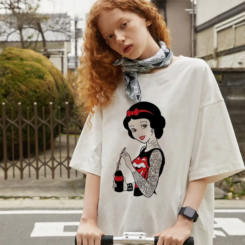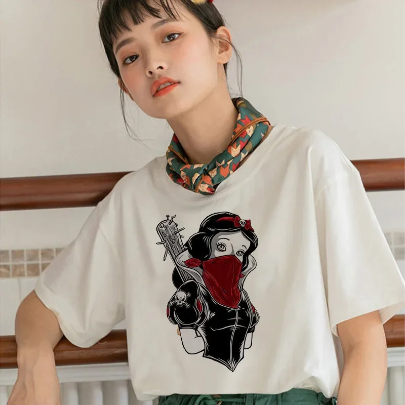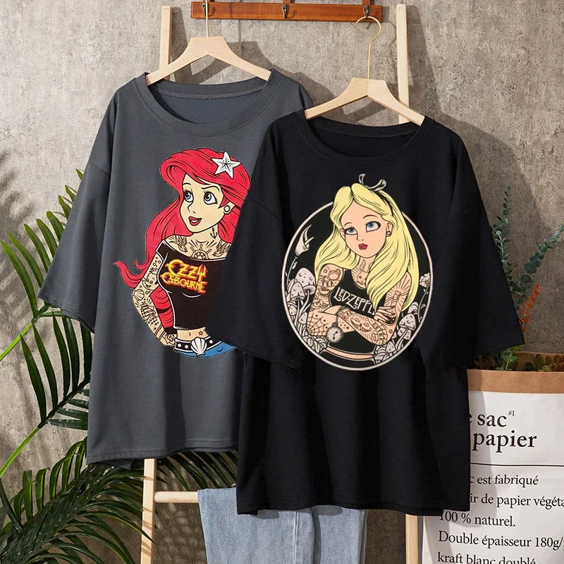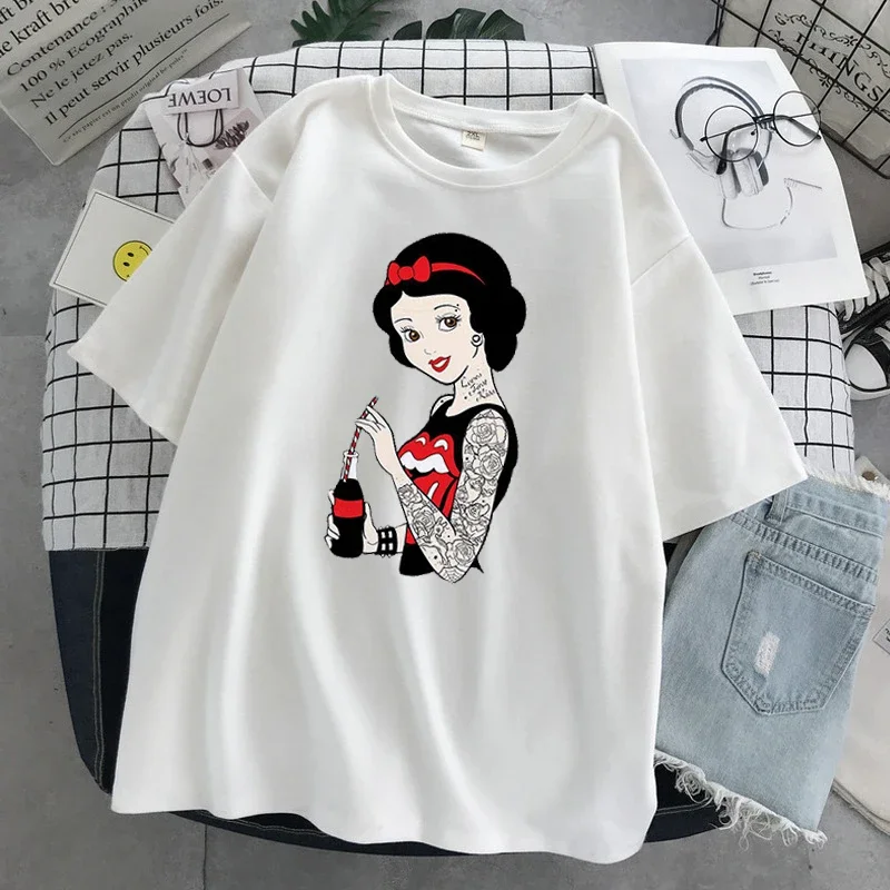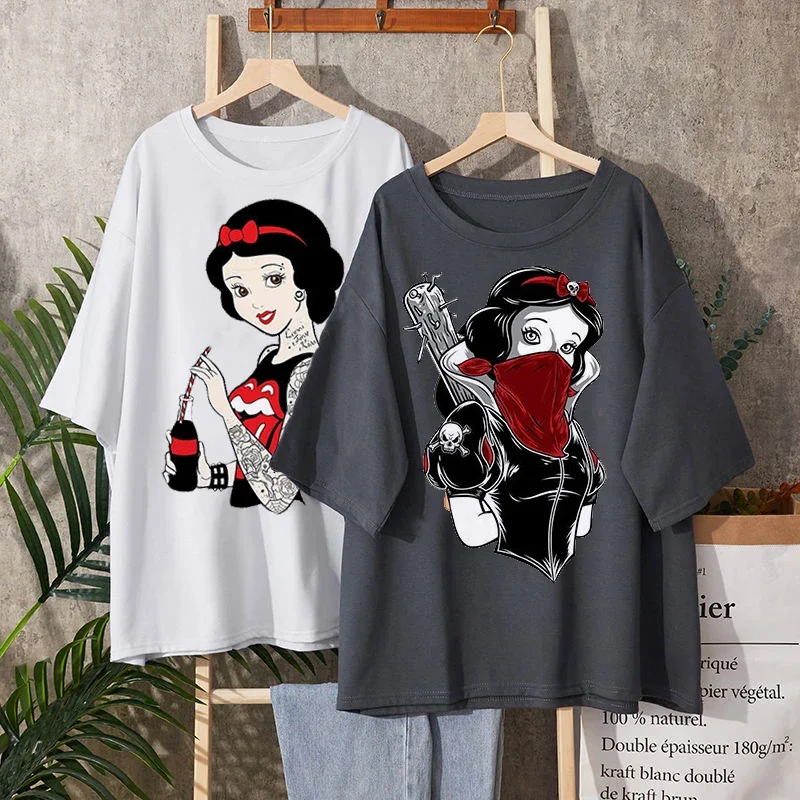 Princess Print Alice in Wonderland Women T Shirt Tops Black Alice Snow White Casual Short Sleeve T-shirt Femme Top Y2K