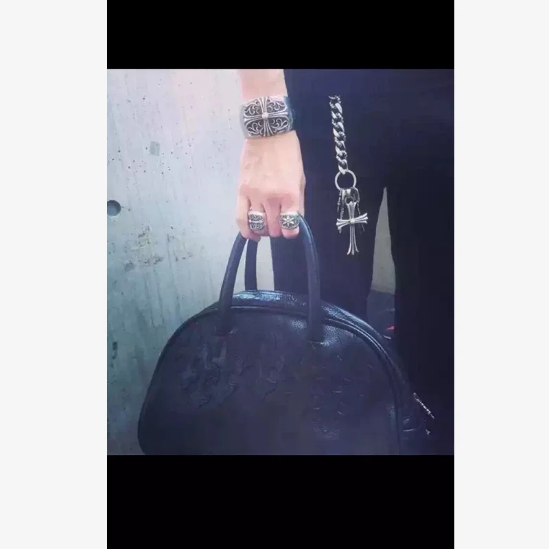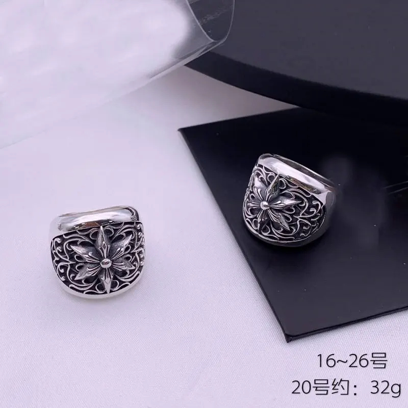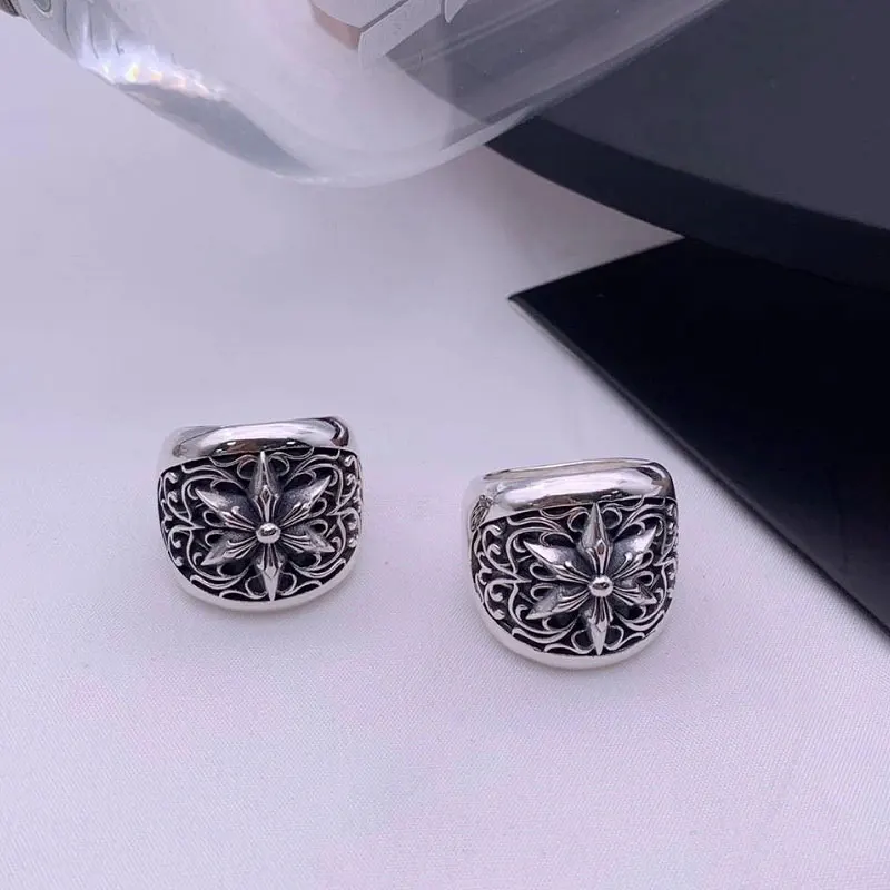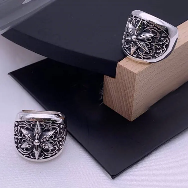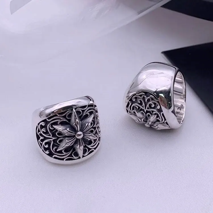 Punk European and American Jewelry 925 Pure Silver Retro Big Vine Flower Hexagonal Star Finger Ring Men's Dominance