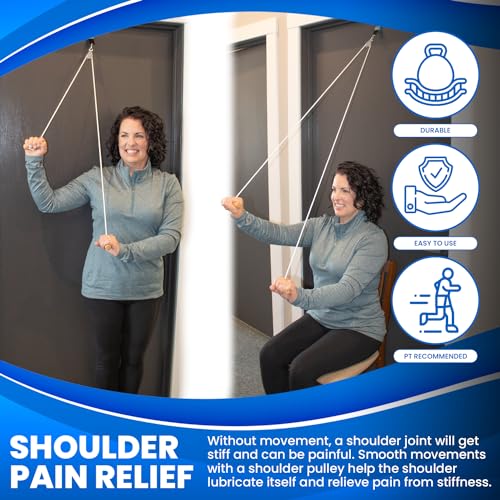 RESTORE SHOULDER HEALTH- Shoulder pulleys use the force of gravity to gently increase range of motion and blood flow to the shoulder joint. This passive exercise helps the healing process and gets you to a pain-free range of motion.SHOULDER PAIN RELIEF- The shoulder is a self-lubricating joint, but if there is little to no movement there is no lubrication. Smooth movements with a shoulder pulley help the shoulder lubricate itself. “Oil” for the shoulder is stored in a sub-surface tissue sack called the bursa. The only way this “synovial fluid” can be pumped from the bursa through the shoulder is with movement.OUR SHOULDER PULLEY-Made with a custom pulley with zinc-coated housing to resist deformation over time. Wooden handles allow easy adjustability of the 85-inch cord to ensure comfort and easy use.METAL BRACKET- Included metal bracket over door hanger makes it easy to attach the pulley system over the top of any door. Fits most 2-inch doors and does not cause damage.FREE MEMBERSHIP TO EDUCATION PORTAL - RangeMasterU is our online community with access to certified Physical Therapists to answer questions and address concerns, plus instructional exercise videos