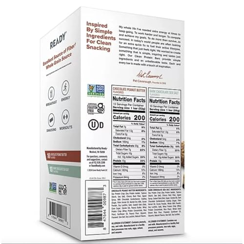 NUTRITIONAL CONTENT: Each protein bar contains 15g of protein, 7g of fiber, and only 200 calories per serving, perfect for balanced nutritionVARIETY PACK: Box includes 20 bars with two delicious flavors - Chocolate Peanut Butter and Dark Chocolate Sea Salt, 10 bars eachDIETARY FEATURES: Non-GMO certified and gluten-free protein bars made with whole grain ingredients as an excellent source of fiberVERSATILE USE: Ideal for breakfast, pre-workout energy, post-workout recovery, or as a satisfying snack between mealsCONVENIENT PACKAGING: Individual wrap ensures freshness and makes it easy to carry these 1.83-ounce bars in your bag, desk, or gym gear