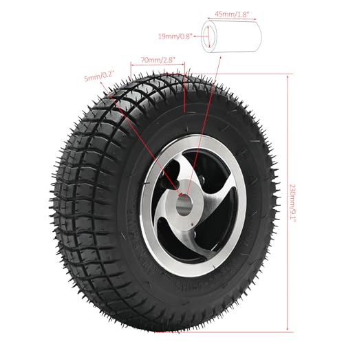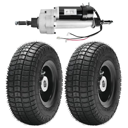 Perfectly Used for for DIY electric bike bicycle scooter ,Robotics, rc lawnmower, small electric gocart, power wheels custom upgrade , golf trolley, engineering vehicle, electric barrow, agricultural vehicle, cleaning machine, trolley, electric sightseeing car, floor sweeper, airport tugs, fork lift , milk carrier, mobile transporter, and the other electric vehicle.ect.Technical Specification: Tire and Wheel Mode: 9x3.50-4 inch; Tire Diameter: 9 inches; Tire Width: 2.8 inches; Rim Diameter: 4 inches; Bore/Axle size:19mm; Centered Hub Length: 2.1 inches;24v 350w differential axle motor: Unload current: ≤2 Unload Speed: 5000rpm Rated Torque: 0.56 N.m Rated Speed: 4250RPM Rated Current: ≤14 Rated efficiency: ≥75% Gear ratio: 21.67 Length of the motor: 405mmWheel Distance: 435mm (17.1 inch)Package includes 1x 24V 350W Motor with Transaxle, 2x 9x3.50-4 Rear wheels