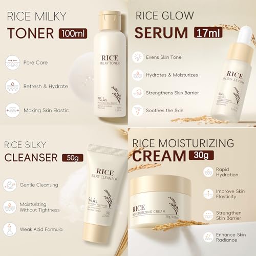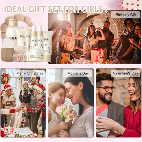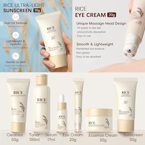 【RICE SKIN CARE ROUTINE KIT FOR WOMEN】: Achieve radiant and healthy skin with our all-in-one rice skincare set skin care for teens 10-12 for Teen Girl Gifts Birthday, designed to cleanse, nourish, moisturize and protect. This elaborately designed skincare set for teenagers includes facial cleanser, toner, sunscreen, facial essence (2 pieces), face cream, eye cream, hair band and facial ice roller. This rice skincare set is suitable for skincare set for girls 10-12 birthday gifts and includes all the daily care you need.【NATURAL INGREDIENTS】: The formula in our rice travel skincare set for girls birthday gifts contains over 85% natural ingredients, including korean rice extract, hyaluronic acid and vitamin C, which promote the production of collagen, even out skin tone, lock in moisture and have an excellent moisturizing effect. Teenage skin care to birthday gifts aims to clean, moisturize and nourish the skin, making it hydrated and rejuvenated.【DEEP HYDRATING & NOURISHING】: Designed to deeply hydrate and nourish, this Skincare for Girls 10-12 Teen Skin Care Kit creates a long-lasting moisturizing barrier that keeps your skin plump and supple. Say goodbye to tight, uncomfortable skin! This rice skin care set for teen girls 10-12 makes skin look firmer, softer and more youthful. No more red, dry skin, but a young, healthy skin!【GIFT SET FOR WOMEN】: The rice skin care set spring gifts for women is an ideal gifts set for Christmas, Valentine's Day, Mother's Day, easter basket essentials,give this beauty skincare kits gifts set skin care for teens to your mother, lover, daughter, sister to keep their skin clean and young. Imagine how happy they will be!【SUITABLE FOR ALL SKIN TYPES】: Whether you have dry, oily or combination skin, this rice facial kit for women has something for everyone. It's non-irritating and adapt to the unique needs of your skin, making skincare set birthday gifts a versatile option for your daily skincare routine. Our skincare gift set for teenage girls is a lightweight formula that is non-greasy, non-sticky, non-pore-clogging and absorbs quickly, leaving skin looking firmer and softer.