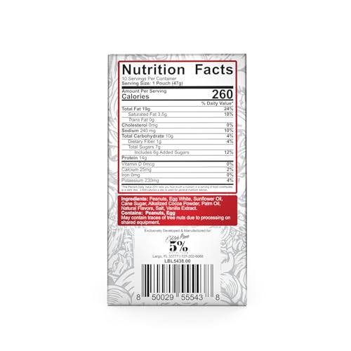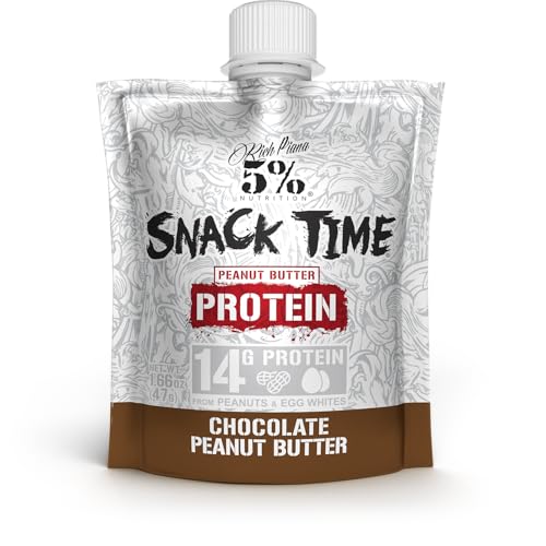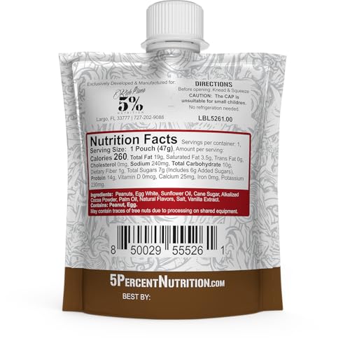 14 GRAMS OF HIGH QUALITY PROTEIN from egg whites and peanuts. Muscle feeding, appetite satisfying protein, NOT collagen or whey. All natural. Real food. Real simple.AMAZING TASTE, TEXTURE & CONSISTENCY: Our chocolate peanut butter snack packs are so delicious, you'll look forward to them all day!Just remember to knead the pouch before opening.SUPER CONVENIENT: Easy squeezy, throw-it-in-your-bag steezy.QUALITY ASSURED: All 5% Nutrition products are produced in certified GMP facilities and third party tested. Vegetarian, dairy free, gluten free, no trans fat, no cholesterol.5% NUTRITION DELIVERS the industry's highest quality supplements, with comprehensive formulations that help you achieve elite level performance. All supplements are produced in certified GMP facilities and third party tested.
