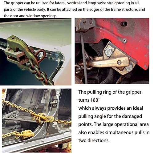 5 Ton Capacity, thats 10,000 Pounds! Minimum of 1-1/2" Reach-around for Flanges, Cowls, Pinch Welds, and LipsThe pulling ring of the gripper turns 180°, which always provides an ideal pulling angle for the damaged points. The large operational area also enables simultaneous pulls in two directions.The gripper can be utilized for lateral, vertical and lengthwise straightening in all parts of the vehicle body. It can be attached on the edges of the frame structure, and the door and window openings.Drop forged construction provides more pulling power and greater wear resistance.90-degree pulling angles can be created with the help of the pull plate delivered with the gripper. The plate works also as an independent tool when repairing the vehicle B and C pillars, hoods etc.