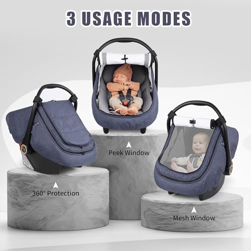 WEATHERPROOF CAR SEAT COVER: Rquite baby car seat cover is made from a double-layer fabric with waterproof cationic outer layer and thick fleece lining, that is windproof, waterproof and heat insulating to keep your baby warm and cosy, especially suitable for winter and cold weatherSAFE PROTECTION & VENTILATION HOLES: Our unique canopy shape gives baby plenty of internal space. This structural design keeps the canopy away from baby's face and the baby can't kick it to prevent suffocation and keep baby safe. When the zip is fully closed, baby still gets ventilation from two air vent holes2 LAYERS WINDOWS & 3 MODES: Our infant car seat cover has 2 layers of windows, there are weatherproof windows and mesh windows. Unzip and roll up the outermost window for easy access to baby and maximum temperature control. Use mesh window to protect the baby and conveniently check the babyKick-proof Design: On either side of the cover, there are two kick-proof fixing straps. These secure around car seats and strollers to keep the cover in place against strong winds and kicking infantsUniversal Fit & Easy Installation: Our baby carrier cover has an elastic bottom that stretches to fit snugly over any car seat, keep your little ones warm and cozy whether you're traveling, facing snow, rain, or need a sunshade for added protection