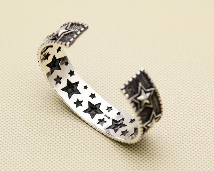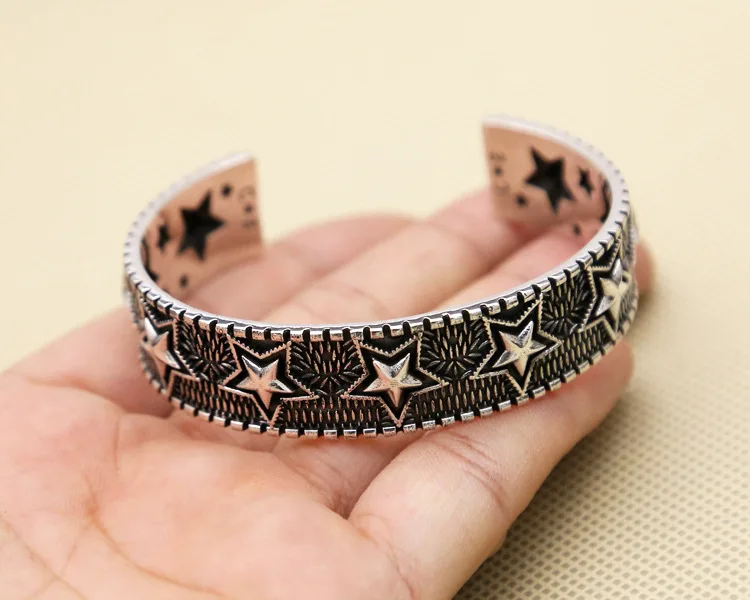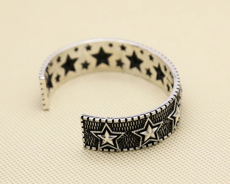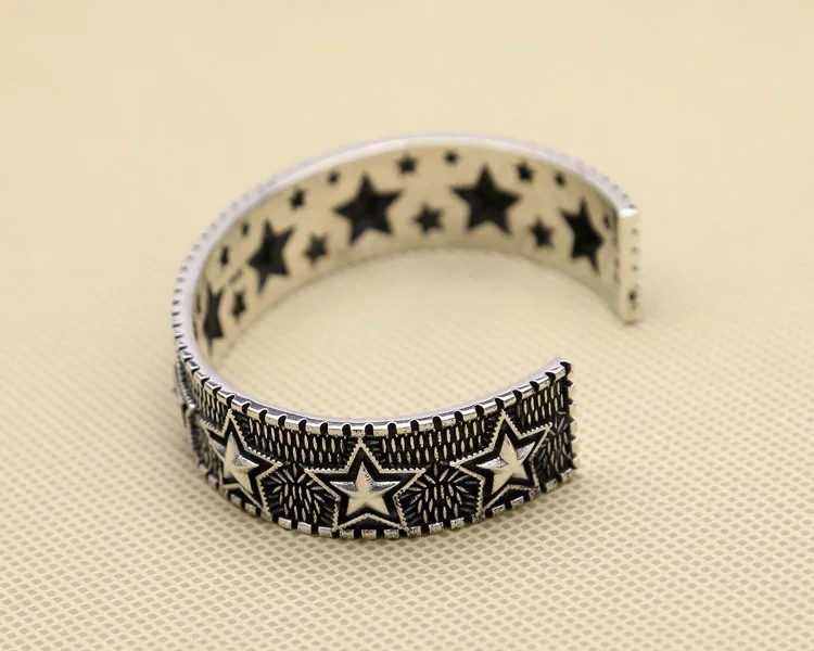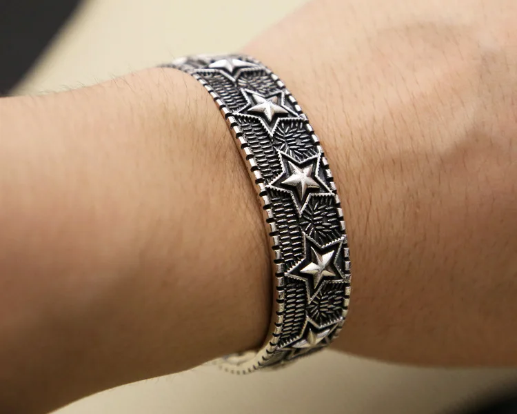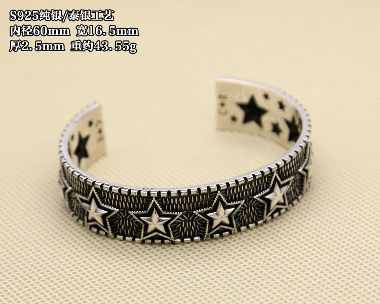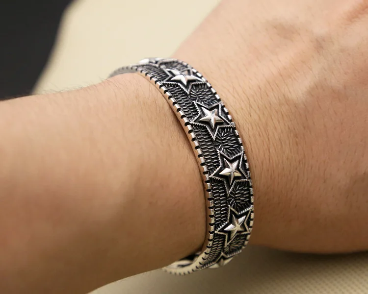 S925 Sterling Silver Five pointed Star Bracelet for Men's Korean Fashion Open Punk Hip Hop Jewelry Thai Silver Bracelet Wide