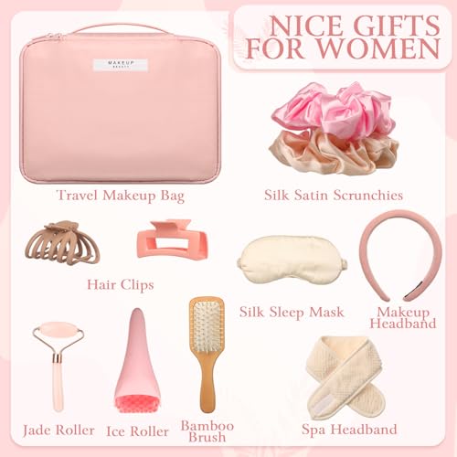 Girls Birthday Gifts Ideas: this is a birthday gift basket that will surprise the recipient; The set includes 1 large pink cosmetic bag, 1 face ice roller, 1 single-head facial roller, 1 square massage comb, 1 elastic band eye mask, 2 hair clips, 1 spa headband, 1 silk sponge headband, 2 hair scrunchies; These products can meet diverse haircare needs, making your haircare routine more efficient and easyGreat Gift Sets: the size of the waterproof cosmetic bag is 9 x 3.1 x 6.2 inches with 3 independent compartments and double zipper design, which can hold a large amount of cosmetics; The interior of the bag is covered with thick sponge to prevent cosmetics from being damaged; The massage comb is made of natural bamboo paddle handle and bristles; The eye mask is soft and has elastic satin on both sides; The facial roller can relieve muscle tension, reduce facial puffiness and rednessExpress Your Emotions In Style: say love, thank you, happy birthday or wish a loved girl to get well soon with a cool gift basket. Encourage, inspire, empower, and spoil your girl with our motivational gifts such as travel toiletry bag, spa headband for women. Surprise a special lady with a thoughtful and pretty packageWarm Gift Box For Women: these women haircare products have cute designs and elegant touches, making them a warm gift for her, such as your sister, friend, teacher, nurse, mom or girlfriend, and can even be a Christian gift. Also suitable as a 20th, 30th, 40th, 50th birthday gift for women These gifts are all carefully crafted and will leave a lasting impression on ladiesFor Any Occasions: the diversity of items in this gift box is suitable as birthday gifts, mother's day gifts, christmas gifts, anniversary gifts, thank you gifts, graduation gifts, teacher appreciation gifts, retirement gifts. Suitable for women, family, housewarming gifts or as a gift choice for other special occasions. They can express gratitude to the women in your life