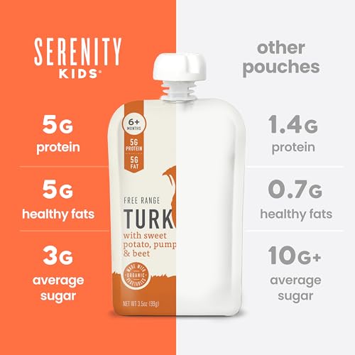 Savory Protein Punch: Meet Serenity Kids turkey pouches, perfect for introducing your baby to turkey puree. With 5g of protein, they're the ultimate toddler food, fueling growth like a tiny powerhouseNo Added Sugar Goodness: Ditch the sweet baby snacks and embrace the real flavors of organic pumpkin and sweet potatoes. Our turkey puree baby food focuses on healthy, delicious ingredients, not sugary fillersEthically Sourced Nutrition: We pack these baby food puree pouches full of ethically sourced turkey and organic veggies. Perfect for parents who care about clean nutrition and want the best for their baby boy or girlFirst Meat Adventure: This toddler pouch is a fab way to introduce your little one to savory turkey puree and veggies. It’s a tasty step forward in your baby's culinary journey, perfect for the adventurous toddlerEasy, On-the-Go Meals: These organic baby food pouches are ideal for busy days with your baby or toddler. Easy to carry and use, they make on-the-go baby essentials and perfect toddler snacks
