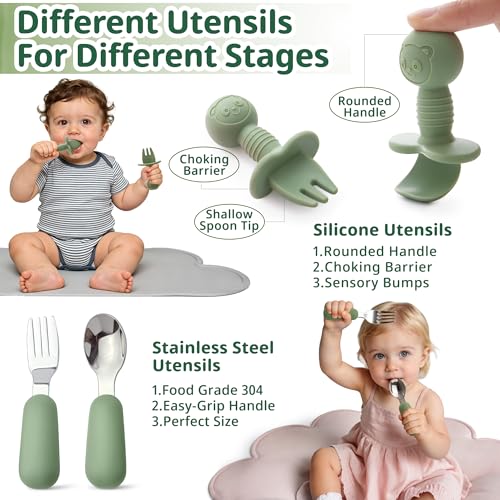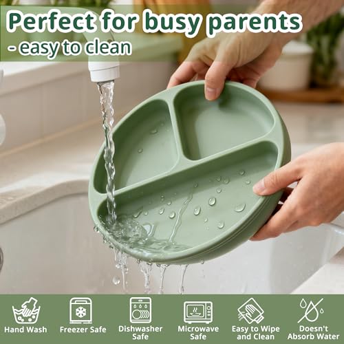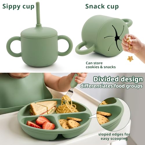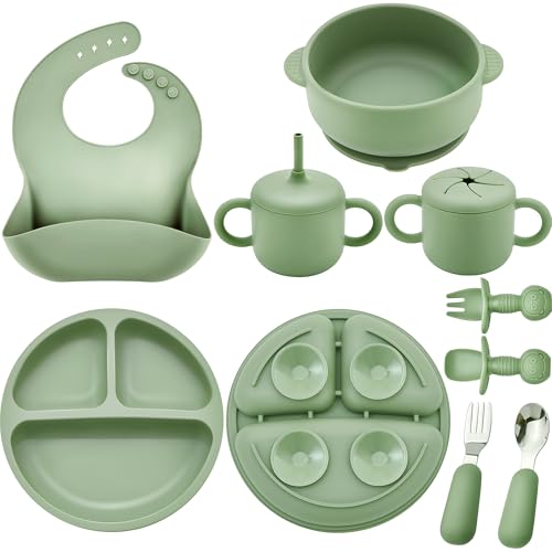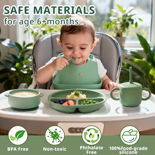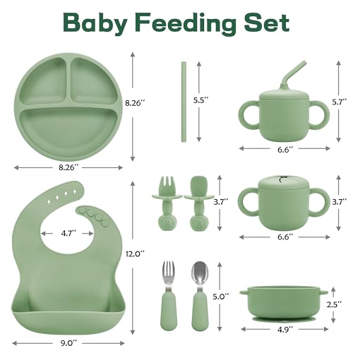 [Safe, Soft & Baby-Friendly Material]: Made from BPA-free, food-grade silicone, our feeding set is completely free from PVC, phthalates, and other harmful chemicals—ensuring absolute safety for babies aged 6 months and up. The soft, rounded edges are gentle on sensitive gums and developing teeth, making it perfect for early-stage self-feeding.[No More Mealtime Mess – Extra Strong Suction]: Our suction bowls and divided plates feature an upgraded suction base that locks firmly onto smooth highchair trays and tabletops. The sectioned plate helps separate different foods, encouraging independent eating while preventing spills, drops, and messes on the floor.[Designed for Real-Life Feeding Moments]: This 9-piece set is built for baby-led weaning, mealtime training, and snack time on the go. It includes:1 suction-divided plate, 1 suction bowl, 1 baby bib with a deep catch pocket, 1 spill-proof straw cup + straw, 1 snack container, 1 first-stage toddler spoon & fork set (silicone), 1 toddler fork & spoon set (stainless steel). Everything is sized just right for tiny hands and growing coordination.[Microwave, Freezer & Dishwasher Safe]: From prep to cleanup, this feeding set is made to make parents'lives easier. All components are dishwasher-safe, stain-resistant, and quick-drying. The silicone bowls and plates are microwave-safe for fast heating, and the whole set can be stored in the fridge or freezer for meal prepping.[Perfect Gift for Growing Babies]: Beautifully packaged and thoughtfully designed, this complete feeding set makes an ideal gift for baby showers, birthdays, Christmas, or any milestone. It's a practical, adorable, and truly useful gift that supports a baby's journey from spoon-fed to self-fed.