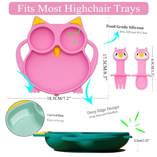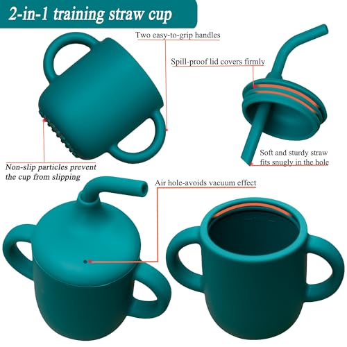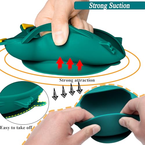 Baby Feeding Set: the silicone baby feeding set that you will receive are 2 bibs with adjustable neckband, 1pc water glass with a straw, 1 silicone bowl with suction, 1 dinosaur plate with suction, 1 dinosaur shaped short handled spoon and fork, and 1 long handled dinosaur spoon.Safe For Toddler:the silicone baby feeding set are made with 100% food grade siliconePractical Design :the bowl and plate of this baby led weaning utensils set are designed with suction cup, which can effectively avoid the plate and bowl sliding down on the table, so as to play a good role of non slip, and to better reduce the mess. A double handled silicone water cup and snack cup can prevent baby from spilling drinks and snacks everywhere. Adjustable bibs can prevent babies from dirtying their clothes with Scattered food.Easy to wash/clean:Dishwasher and microwave safe. Silicone can withstand low and high temperatures, easily transitioning from the refrigerator or freezer to the oven or microwave. Oven safe up to 375°F. Top-rack dishwasher-safe. Or just wash with warm soapy water .Feeding At Different Stages: Silicone baby fork and spoon are best for first stage starters (teething infants) and toddlers. The soft long handled spoon fork and silicone bowl are convenient for us to feed babies. Cups, bowls, and plates are convenient for babies to eat independently. Adjustable bibs can be worn from 6 months to 6 years old. Our baby tableware set will help transition your baby to self feeding, it is a perfect birthday gift, baby shower gift.