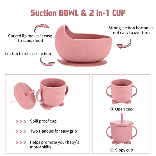 Safe & Certified - Made from are 100% Food Grade Silicone, CPSIA Children's Product Approved. BPA-free, Phthalate-free, and PVC-free. Your baby’s safety is our highest priority in mind with the design of this baby feeding set. We make sure only to use non-toxic baby-safe materials and nothing else. You can trust that our products are completely safe for your little one.Self Feeding Set of 6 Pieces - Our full baby feeding set of 6 pieces accommodates all baby feeding stages, from purees to solid foods. It includes a bib with food catcher, 2 bendable utensils (spoon and fork), a suction bowl, a suction plate and a sippy cup. This provides you with a practical, long-lasting product. Your baby will be an independent eater in no time!High Quality & Easy to Clean - The high-quality silicone makes them soft and gentle for full safety, yet unbreakable so you don't need a replacement. This baby eating supplies set are easy to clean, dry quickly and are non-porous to avoid bacteria-build up. All pieces are dishwasher safe, easy to wipe down and suitable for microwave and refrigerator. You can spend more time with your little one and spend less time cleaning.Smart Design - The plate is designed with compartments so you can have chunks of vegetables, fruits, and other solid foods separately. The plate and bowl provide strong suction that makes it hard for babies to pull and make a mess. Bowl has an elevated design for easy scoop and prevents spilling over the bowl. Help develop your baby's skills and make meal time more enjoyable for everyone.Cute Gift Choice - The baby led weaning feeding set comes with everything you need to keep mealtime neat and tidy; Ideal for your baby or as a gift for the birthday, baby shower, baby milestone celebration or other special occasions.
