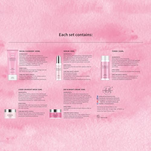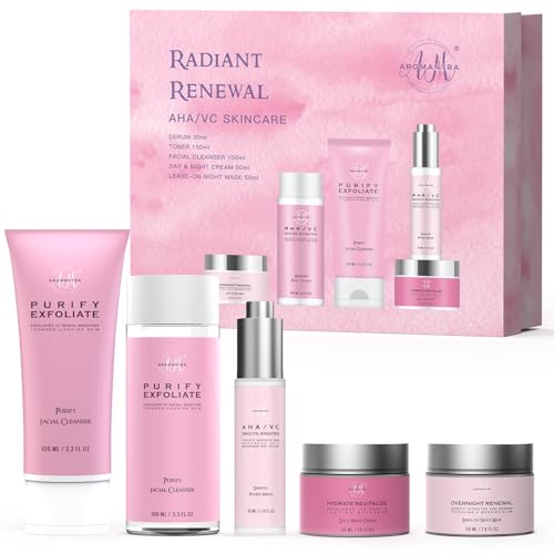 【Daily Skin Care Kit】This 5-piece skincare set beauty products contains our 100ml Facial Cleanser, 30ml Serum, 150ml Toner, 50ml Cream And 50ml Leave On Night Mask. This skincare bundle leaves skin looking more radiant and renewed and helps improve skin’s texture so it feels soft and smooth【Smooth, Renew & Boost Radiance】Our advanced formula is enriched with Lactic Acid, Vitamin C and Lavander Oil. AHA helps to gently exfoliate the skin, removing dead skin cells and promoting cell turnover. Vitamin C helps even out skin tone. Lavender Oil has calming properties that can soothe irritated skin【Suit for Acne-Prone and Sensitive Skin Types】In addition to removing dead skin cells, AHA also removes dirt and oil—all of which can clog pores and lead to breakouts. Lavender Oil reducing redness and moisturizes irritated skin without worrying about irritation【Skin Care Sets for Women】The producs have a light and fresh texture which is rich in natural ingredients and provides a perfect absorbing to the deep inside of the skin without being greasy. Give the gift of glow, more beautiful skin with Aromatra!【Makes A Terrific Gift Idea】Containing five full-size skincare products, this skincare set makes a fabulous gift for yourself or someone else. Beautiful packaging and practical use make it a great women gift ideas. Top birthday gifts for women, gifts for wife, gifts for girlfriend, gifts for her, gifts for moms. Take care of their skin and maintain a youthful appearance