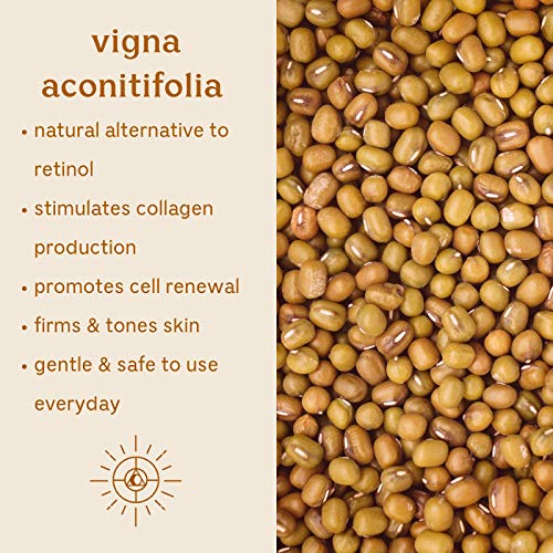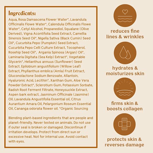 Boost Collagen & Firm Skin — Vigna Aconitifolia is a botanical alternative to Retinol. This powerful ingredient is a natural collagen booster, promotes skin cell renewal, and is gentle & safe to use everyday.Moisturize & Hydrate — Hyaluronic Acid, Argan Oil, Black Cumin Seed Oil, and Rosehip Seed Oil help improve skin’s elasticity while leaving it soft and smooth. Algae extract firms the skin while Propanediol improves penetration of all these nourishing.ingredients.Protect & Reverse the Signs of Aging — Pumpkin seed stem cells along with Calendula, Lavender and Rose hydrosols contain potent antioxidants that protect your skin from free radicals and repair damaged skin.Naturally Restore Balance — Squalane is an element in our bodies that decreases as we age. This revolutionary ingredient restores the balance of your skin's oils for a firm and moisturized complexion.Plant-Based & Cruelty-Free Skincare — Proudly made in the USA with non-GMO, phthalate-free, paraben-free, vegan friendly and 100% natural & organic ingredients.
