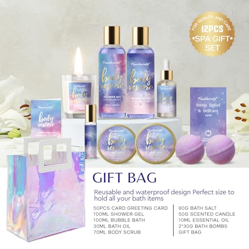 Deluxe 12 Piece Set - Our luxury self-care package is filled with all the body soothing spa essentials a woman needs! The spa gifts for women with shower gel, bubble bath, body scrub, bath salt, bath oil, 2pcs bath bombs, scented candle and cards. Packed in a reusable beautiul bag, the bath set for women is a perfect choice for yourself or as a giftSatisfy All Your Needs – From daily showers (shower gel, bubble bath) to skin care (bath bombs, salts, candle, bath oil), plus self-care tips and a reusable bag. Every bath need is been covered by this beauty bath gift basket bag for herClassic Perfume-Grade Scent – Every bath essential carries a timeless fragrance inspired by iconic classic perfumes: bright citrus top notes and warm woody base notes. Turn daily showers into a luxurious "fragrance-on-skin ritual" that lingers beautifullyReusable Waterproof Gift Bag Included - Comes with a durable, waterproof gift bag (perfect size to hold all bath items) that’s reusable long after the set is enjoyed. Use it to store bath products, travel toiletries, or even as a cute organizer—adding extra valueThoughtful Gift for Every Occasion – Whether it’s birthdays, anniversaries, holidays, or “just because,” this all-in-one bath set comes packed in a stylish reusable gift bag, making it a ready-to-give present. Surprise her with a spa-like experience in this gift for her that shows you care about her self-love