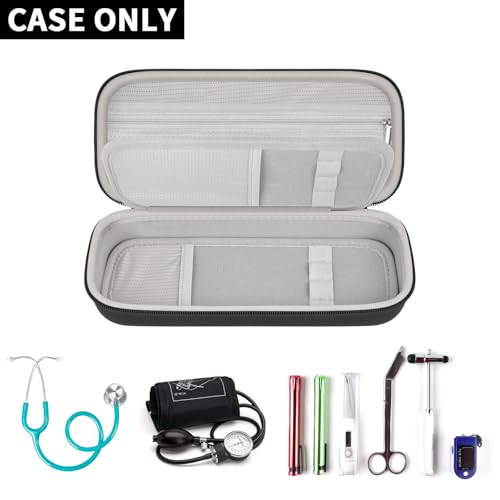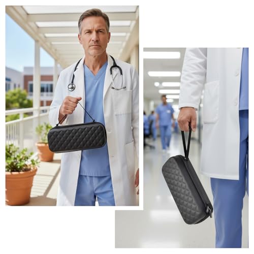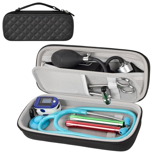 Wide compatibility Stethoscope Case: This stethoscope holder is compatible with 3M Littmann Classic III Monitoring/for 3M Littmann Cardiology IV Diagnostic/for 3M Littmann Lightweight II S.E/for MDF Acoustica Deluxe Stethoscopes and other models, as well as other accessories,like blood pressure monitor. Outer Size: 11x3.15x4.7 inches.(Case only. Stethoscope or accessories are not included.)Wide compatibility Stethoscope Case: This stethoscope holder is compatible with 3M Littmann Classic III Monitoring/for 3M Littmann Cardiology IV Diagnostic/for 3M Littmann Lightweight II S.E/for MDF Acoustica Deluxe Stethoscopes and other models, as well as other accessories,like blood pressure monitor. Outer Size: 11x3.15x4.7 inches.(Case only. Stethoscope or accessories are not included.)Hard & Protective Case for Stethoscope: Made of hard EVA material,the stethoscope box features nylon shell with a soft inner lining,offering water resistance, impact resistance, tear resistance, and anti-static properties.It can effectively prevent drops and scratches, ensuring the safety of your stethoscope, sphygmomanometer and other valuable medical equipment, Suitable for hospital clinical practice, medical supply storage, nursing school essentials.Portable Carrying case for 3M littmann Stethoscope: This stethoscope travel case is small and compact to be put into suitcase, backpack or luggage.With an adjustable handle strap, you can use 2 ways to carry the stethoscope bag: hold the strap or hang the nurse work bag on your wrist, particularly suitable for professional high-intensity use and mobile emergency needs. This doctor bag ensures that tools are always organized and readily available.Stylish & Thoughtful Present: With smooth double zippers and simple and elegant black diamond pattern design, this stethoscope case has a stylish appearance, which is really a thoughtful present for white coat ceremony, like doctors, nurses, nursing students.It is not only a medical bag, but also a symbol of professional style.