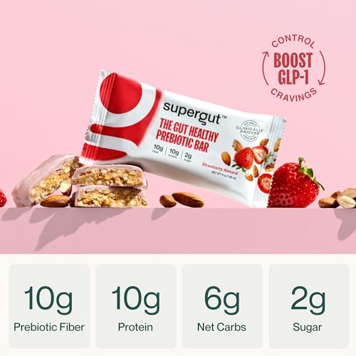 Packed with Nutrition: Kick hunger to the curb with Supergut’s Gut Healthy Prebiotic bar, an on-the-go snack that helps curb cravings. Each bar contains 10 grams of prebiotic fiber, 10 grams of protein at under 6 grams of net carbs and less than 2 grams of sugar. Strawberry Almond flavor.How GLP-1 works: GLP-1 is a hormone produced in the gut during digestion that may help to maintain a feeling of fullness and support metabolic health. Supergut's prebiotic fibers, including resistant starch and beta-glucan, are formulated to promote GLP-1 activity and help control cravings.Seize Your Day: Whether you’re running errands or 5Ks, our bars will power you through with stable energy. Enjoy one as a post-workout snack at the gym or take it on a hike to enhance your nutrition on-the-go.Works with Your Dietary Needs: Our Gut Healthy Prebiotic Bar is non-GMO, keto-friendly, soy-free, and made with no artificial ingredients.Inspired by Family, Crafted by Science: Our mission is to create incredible tasting nutrition that’s backed by science of the gut microbiome. With our deep scientific foundation, our ambition is to be the most evidence-based and transformative food company in the world – you can trust your gut with us.