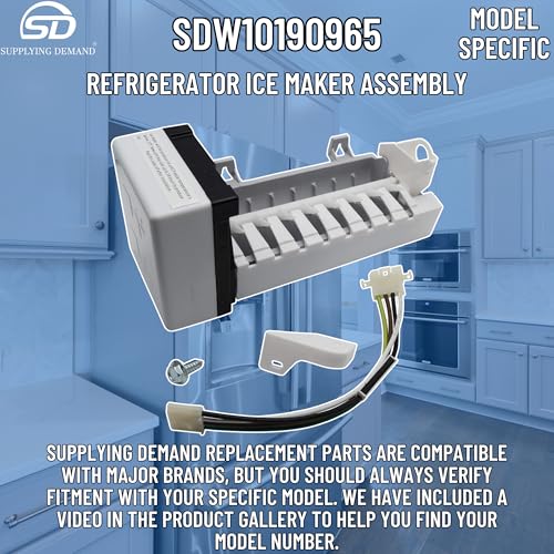Please see Model Number fitment information at the bottom of this page before placing your order for this part. Alternate part numbers include WPW10190965, AP6016628, 1471727, 626633, 626661, 626662, PS11749920, W10122506, W10122507, W10122510, W10190969, W10270037, and WPW10190965VP.115V , 185W , 1.6 Amps , 60Hz , (8) Cube heated mold with flat (4) pin plug , Ice maker only, reuse hardware and bail arm from the old unit , Fits model specific side-by-side refrigeratorsIt is important to disconnect your appliance from the power and water supply before servicing. If your new ice maker is not making ice the freezer temperature may be too high, your water filter may be clogged, your thermostat may be defective, or you may have inadequate water pressure.Supplying Demand replacement parts are compatible with Major Brands, but you should always verify fitment with your specific model. We have included a video in the product gallery to help you find your model number and information in the description below.SD products come in Supplying Demand packaging.