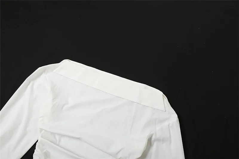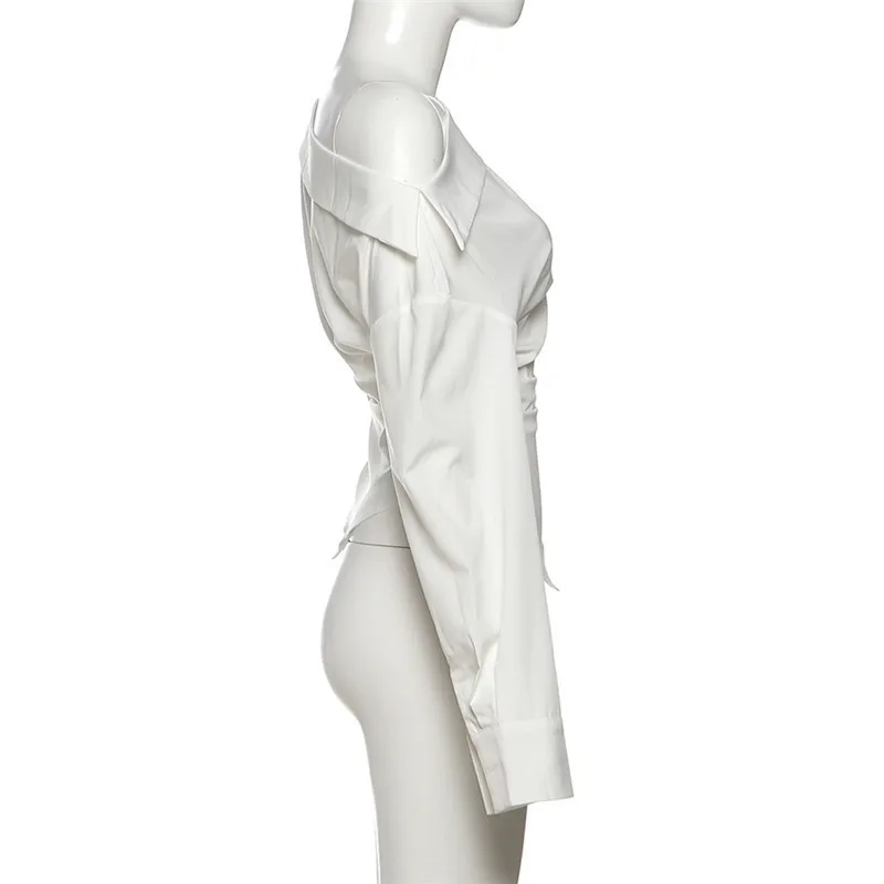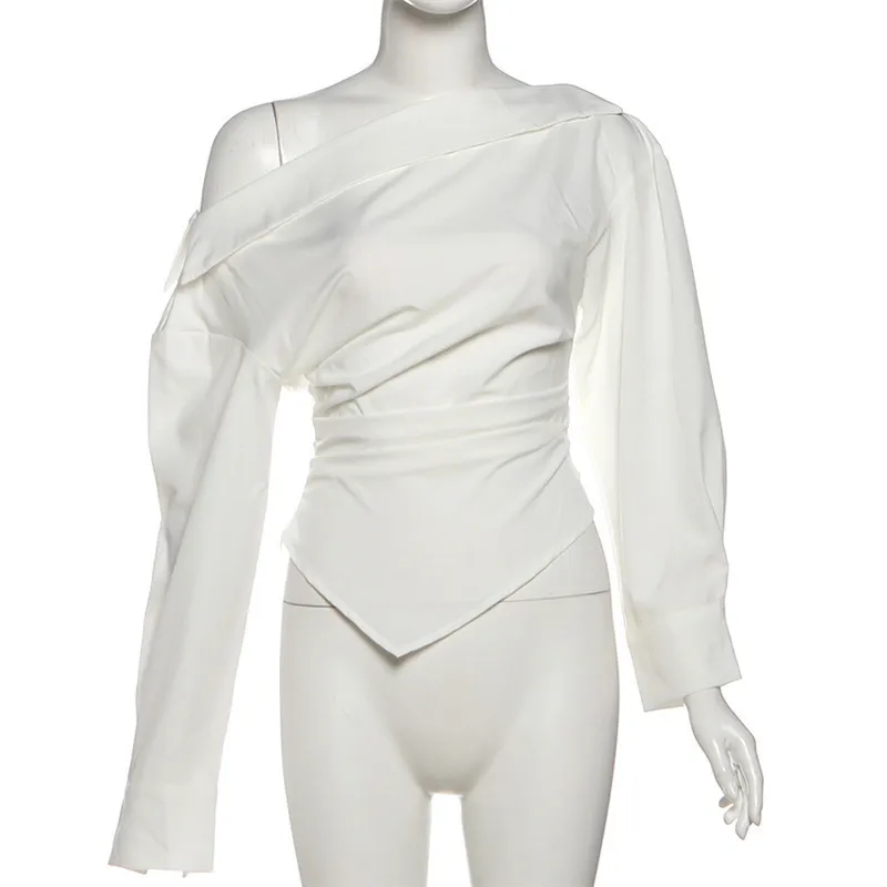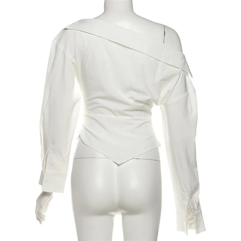 SylCue Casual Fashion T-Shirts Woman Lapel Skew Collar Off Shoulder Full Sleeve Irregular Hem Daily Simple Basic Classic Tops
