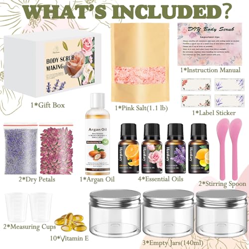 COMPLETE DIY BODY SCRUB KIT: THALUNA all-in-one body scrub making kit includes: 1 pink salt (1.1lb), 1 argan oil (100ml), 3 essential oils, 2 dried flowers, 10 vitamin E, 3 empty salt scrub jars (140ml), 1 label sticker, 2 stirring spoons, 2 measuring cups, and 1 instruction manual. A luxurious spa and body scrub experience that meets all your needsFUN MAKE YOUR OWN BODY SCRUB KIT: Experience the creative fun of customizing your own spa-quality products! Our DIY body scrub making kit lets you mix natural ingredients, blend personalized scents, and create unique scrub textures - Whip up your ideal scrub right at home. Perfect for first-timers, a delight for party nights with friends, and a wonderful memory-making activity to create personalized recipes with familyNATURAL & MOISTURIZING INGREDIENTS: Our Lavender essential oil provides calming scent, rose oil offers romantic fragrance, sweet orange oil delivers mood-boosting freshness, argan oil and vitamin E deeply nourishes your skin, specially pink salt help helps smooth rough, uneven skin, revealing softer, and glowing skin instantly. While dried flowers add gentle exfoliation and visual appeal for complete skincareENJOY SPA TIME AT HOME: Enjoy luxurious exfoliation in your own bathroom! Use our gentle scrub on rough elbows, dry knees, cracked feet, and uneven skin areas. The natural formula helps remove dead cells, unclog pores, improve skin texture, and enhance moisture retention - Just rinse away to reveal your fresh, glowing complexion. A Dual-Action Scrub: Experience deep purification that cleanses your skin while locking in moisture, leaving it perfectly balanced—no tight or dry IDEAL GIFT SET FOR ALL OCCASIONS: Beautifully packaged in elegant gift box, great as Christmas gifts, Mother's Day gifts, Thanksgiving gifts, birthday gifts, bath spa gifts for women, teen girl gifts trendy stuff, shower steamers for women, gifts for teen girls 16-18, shower bombs for women. Suitable for women, men, beginners, and skincare enthusiasts - a thoughtful present that combines creative fun DIY scrub kit