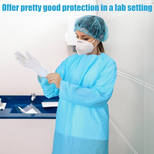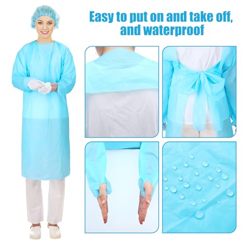Unisex Design and Size: no more worrying about the fit, our PPE gowns for adults are designed to cater to most women and men with their unisex design and extra large size of about 46 x 75 inches/ 117 x 190 cm, and designed with waist ties, allowing you to wear or move comfortably and freelyComplete Protection: blue isolation gowns feature long sleeves, and the thumb loop that ensures the gown stays in place, covering your body completely; Additionally, the tearing off neck provides safety and easy removal, ideal for various conditions and environmentsWaterproof and Wearable: experience the quality of our disposable scrub gowns, crafted from CPE and PE material, not only ensure durability but also provide maximum protection against contaminants, and they are resistant to water, oil, stains, dust or other liquids, ensuring your safety and comfort in the long runRich Availability: our isolation gowns disposable come in pack of 30, to cater to both personal usage and home utilization, ensuring everyone stays protected and safe, and the multipack also offers savings, suitable for unisex adultsBroad Usage: our blue disposable gowns are incredibly easy to wear and remove during bathing loved ones, autoclaving, cleaning, dining, cooking, painting, and more, thanks to their effective design, and suitable for nursing, lab, industrial company, home or other places where the clean environment needs to be maintained, making them perfect for long wear periods