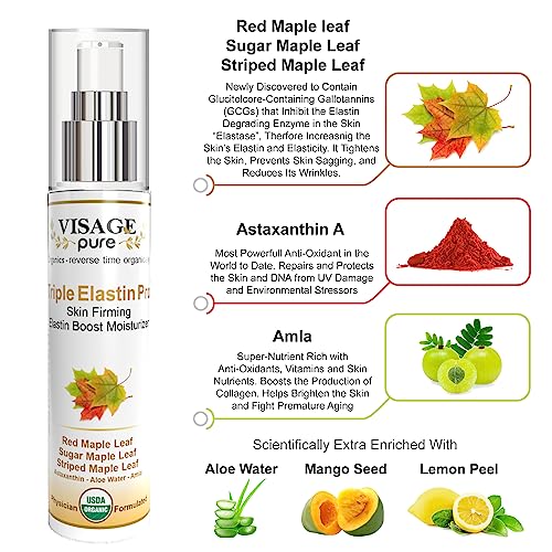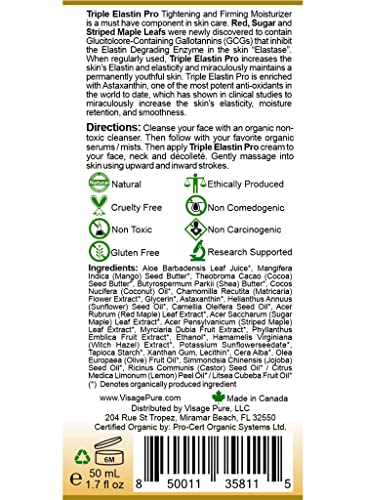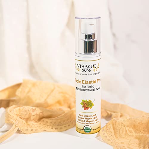 A MUST HAVE COMPONENT IN SKIN CARE - Triple Elastin Pro Moisturizer is an essential component in skin care. As Elastin diminishes, the skin loses its elasticity and its ability to bounce back, often resulting in fine lines, wrinkles, and sagging.SCIENTIFICALLY AND CLINICALLY APPROVED - Red, Sugar and Striped Maple Leafs were newly discovered to contain Glucitolcore-Containing Gallotannins (GCGs)” that inhibit the Elastin Degrading Enzyme in the skin “Elastase”.SKIN FIRMING - When regularly used, Triple Elastin Pro Moisturizer increases the skin’s Elastin and elasticity and miraculously maintains a permanently tight and youthful skin.SUITABLE FOR ALL SKIN TYPES - This luxurious, rich, and creamy moisturizer absorbs easily into the skin leaving your skin feeling soft, dewy and radiant. This moisturizer is non-comedogenic. Please make sure to cleanse your skin properly prior to applying the moisturizer to increase the absorption of the ingredients and allow maximum results.ORGANIC AND TOXIN FREE - Triple Elastin Pro Moisturizer is a USDA organic moisturizer. Therefore, it is free of pesticides, harmful herbicides, synthetic fertilizers, genetically modified organisms (GMOs), carcinogens, and other additives or chemicals.