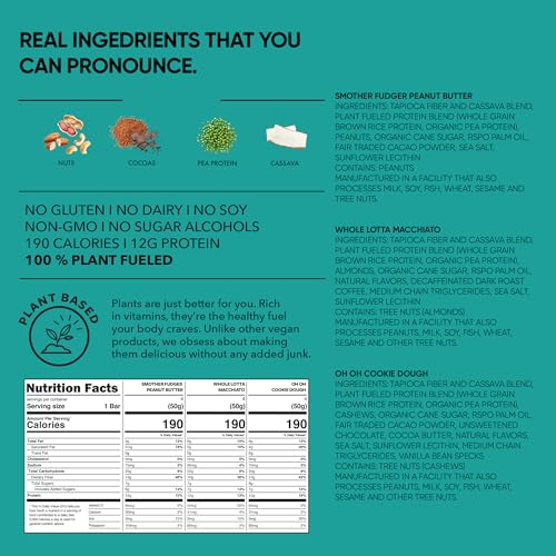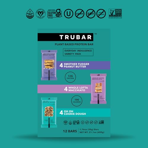 TOO GOOD TO BE PROTEIN BARS: Meet the Peanut Butter, Whole Lotta Macchiato, and Cookie Dough Variety Pack Protein Bars! Enjoy indulgent flavors perfect as breakfast bars, a post-workout snack, or for those uncontrollable sugar cravings!REAL INGREDIENTS YOU CAN PRONOUNCE: Indulgent Nutrition means eating great-tasting foods made with simple ingredients you can actually pronounce. Our plant-based ingredients allow us to create delicious, healthy indulgences that are vegan, dairy free, soy free, gluten free, and free of sugar alcohols. We make it easy for you to enjoy what’s under the wrapper without stressing about what’s in it.ENJOY GUILT-FREE INDULGENCE: Snack your way through nutty, coffee-infused, and cookie-inspired flavors with only pronounceable ingredients like Almonds, Cassava, and Pea Protein. These bars are free of gluten, dairy, soy, and sugar alcohols and pack a powerful 12g of lean, plant protein and 11g of fiber. A light, 190-calorie snack that keeps you energized and satisfied anytime!INDULGENT TASTE INSPIRED BY WOMEN: TRUBAR's Protein Bars are crafted with her in mind – and by her. We asked women what they wanted, and they told us: flavors that excite their taste buds, clean ingredients that fuel their day, and values they can stand behind. Indulgent Nutrition combines flavor and function so she can feel good about what she eats and shares. (P.S. Men and kids love them, too!)EXPLORE EVERY FLAVOR ADVENTURE: Dive into the decadent taste of Smother Fudger Peanut Butter, the rich coffee notes of Whole Lotta Macchiato, and the cookie dough bliss of Oh Oh Cookie Dough. The perfect way to enjoy all three flavors and find your next go-to snack!