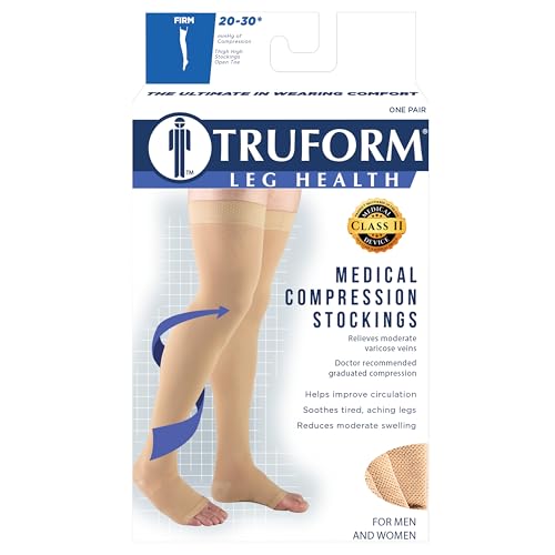 Truform 0868; Medical support hose; Unisex style durable knit; 20-30 strength graduated compressionSilicone grip lined top band; Defined heel enhances fit; Easy inspection sandal wear toeless footUse for extensive sitting or standing, travel, pregnancy, post surgery recovery, improved circulationHelps relieve swelling, varicose veins, spider veins, sore aching muscles, edema, DVT blood clotsMade in the USA; Measure according to size chart; Latex-Free; Nylon and Spandex construction