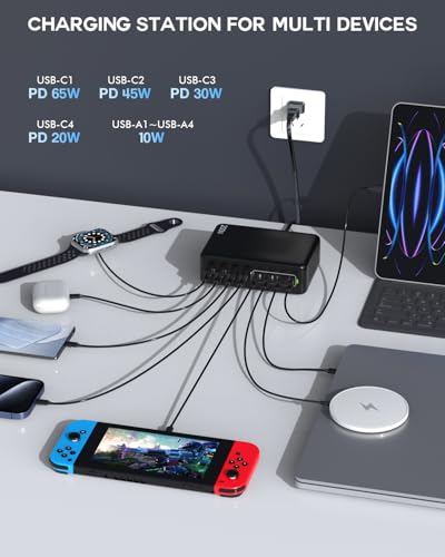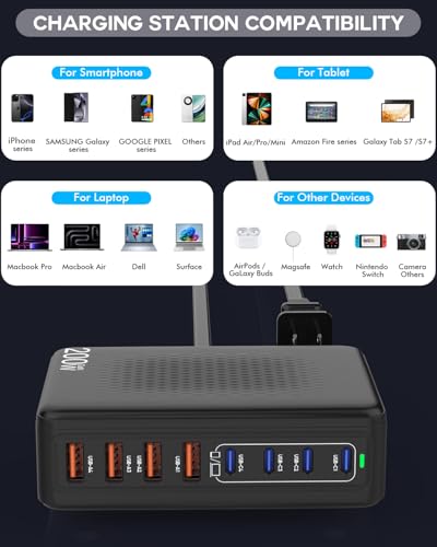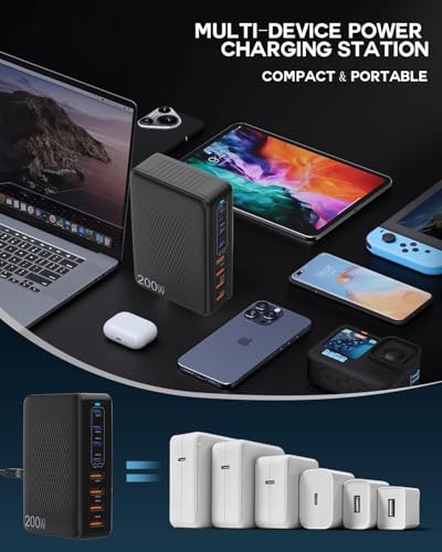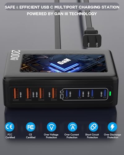 【200W 8 Port Charger Station】Our USB C charging station has 8 independent output ports, 4 USB-C ports and 4 USB-A ports. The dedicated 65W USB-C port provides full speed power for laptops. Power transmission synchronizes fast charging with various devices such as laptops, Smartphones, tablets, headphones, and smartwatches. Unlike most traditional chargers, our USB C charger block features intelligent dynamic current distribution to ensure that multiple devices charge at full speed simultaneously【Latest GAN III USB C Charging Station】The USB hub block adopts GAN-III chip technology, with built-in multiple protection systems and high-quality microchips. Gallium nitride (GaN) has higher energy efficiency, stronger radiation resistance, and greater heat dissipation, making our USB power block smaller and safer. In addition, protection systems prevent equipment from overcharging, overheating, short circuits, overcurrent, and overvoltage, providing reliable safety protection for your devices【8-IN-1 Portable and Compact Charger Block】The USB power block can effectively power multiple devices simultaneously while reducing clutter, making them perfect for limited or shared spaces, whether you're at your desk or in a conference room. Small size saves you 50% space and fits easily into pockets, handbags, travel cases. The 1.5M/5FT AC extension power cord can be extended to the desktop for charging. Adequate multi port options eliminate the need for tangled cables or competing sockets【Universal Compatibility】USB-C port and USB-A port charger block supports PD3.0 / QC3.0 / PPS / SCP protocols. The USB C & USB A charging station fast charging for multiple devices apple iPhone 17 16 15 14 13 12 11 Pro Max Air Mini Plus/ XS Max/ XS/ X/ XR/ 8 Plus/ 8, iPad Pro, AirPods Pro, Samsung Galaxy S22/21/20/10/9/8/7/6, Note 20/10 Plus, A71/51/50/10, Galaxy Z Fold 3 5g, A90 5G, A80, A70, Book S, Tab S7/S7+/S8/S8+/S8 Ultra and switch, speaker, lamp, smartwatch, tablet, etc【What You Get】Includes 1×200W USB charger block (4USB-C + 4USB-A) with 5FT/1.5m detachable power cord. If you have any questions about the USB hub block, please feel free to consult us at anytime. Our professional team will make every effort to provide you with satisfactory service. The all-in-one USB C charging station eliminates the need for multiple adapters. We are very confident in the long-lasting performance of the certified USB C Fast charger and power cord