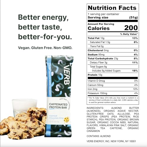 SUSTAINED ENERGY WITHOUT THE CRASH: Power through your day with clean, long-lasting energy. Each caffeinated high protein low sugar energy bar contains as much caffeine as an espresso, sourced from organic green tea for smooth, jitter-free focus, no midday crashes. Unlike energy drinks or carb-heavy protein bars, our plant-based energy bars provide a steady boost, making them perfect for work, workouts, travel, study sessions, or marathon trainingHIGH PROTEIN, NUTRITION BAR: While common protein bars, fiber bars and breakfast bars are heavy on carbs & sugar to provide you with enough energy, Verb Bars are designed to be simple, delicious, and clean. They're diet-friendly energy bars that have just the right amount of sweetness just 6g of sugar and only 200 calories per serving--making for the perfect hunger-busting snack bar that won't jeopardize your fitness goalsDELICIOUS OATMEAL CHOCOLATE CHIP PROTEIN BAR: Loved by millions of customers, this is the softest protein bar on the planet! Verb Energy Caffeinated Protein Bars deliver the perfect balance of sweetness and texture, reminiscent of a freshly baked oatmeal chocolate chip cookie. Unlike the dry, chalky, or dense protein bars you’ve tried before, ours are light, moist, and satisfying, crafted by chefs to ensure every bite is bursting with rich chocolatey goodness and comforting oat flavorCRAVE-WORTHY SNACK BARS FOR A DAILY ENERGY ESSENTIAL: At Verb Energy, it's been our mission to radiate energy that lights you from the inside and moves you into a moment of life that's more vibrant, bright and positive. By making delicious low sugar energy bars and protein bars or vegan, organic bars that you can stash in your bag or drawer anytime, we hope to help keep you energetic and happyABOUT US: We were tired of waiting in line for overpriced coffee and energy drinks that left us jittery, crashed our energy, and weren’t there when we really needed them. So we created the Verb Caffeinated Energy Bar—a delicious, pocket-sized bar packed with as much caffeine as an espresso, but made with Organic Green Tea for a focused, jitter-free boost. Years of perfecting our recipes led to our soft, flavorful bars designed to fuel your best self. Stay energized!