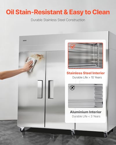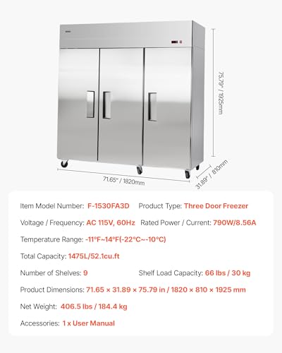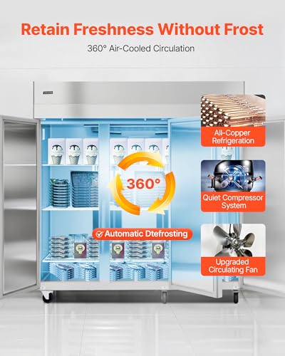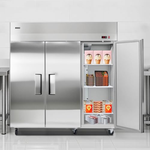 Rapid Freshness Lock: This commercial freezer combines efficient freezing with a digital temperature display, ensuring food stays fresh while saving energy. Fast freezing at -11℉ to 14℉ (-22℃ to -10℃) with smart digital controls for versatile storageFrost-Free Air Cooling: Our commercial kitchen equipment integrates frost-free air cooling with an automatic water evaporation system, avoiding ice buildup and reducing energy use. It ensures fresh ingredients and efficient long-term storageLarge Storage Capacity: Designed for bulk food storage, this commercial reach-in freezer offers a 52 cu.ft. capacity with 12 adjustable shelves. Each layer supports 66 lbs (30 kg) heavy loads, keeping ingredients organized and easy to accessDurable Construction: Built from corrosion-resistant stainless steel, this commercial upright freezer is durable, stylish, and easy to clean. Four casters allow flexible movement, while LED lighting improves nighttime visibilityWide Application: Whether in restaurants, shops, or homes, this upright freezer fits various needs. Ideal for kitchens, garages, and storage rooms, it provides a reliable solution for keeping food fresh in various settings