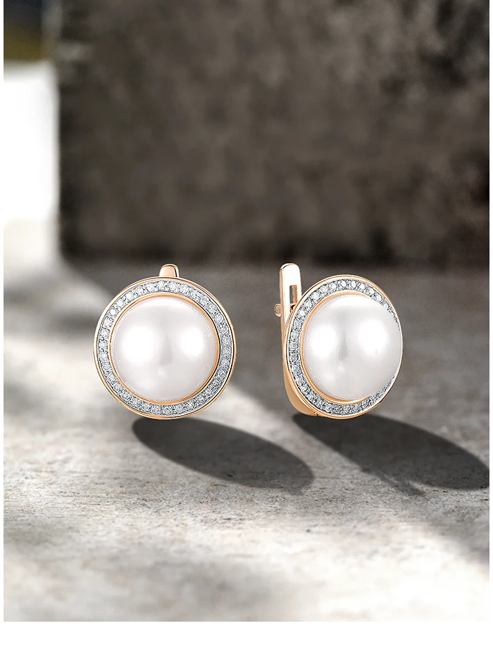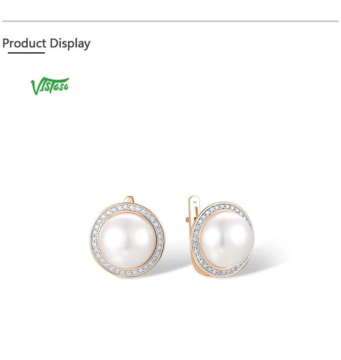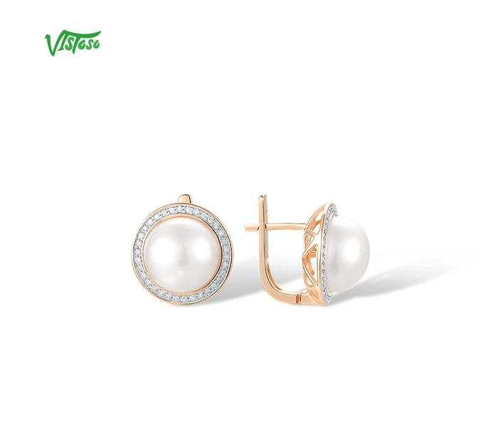 VISTOSO Genuine 14K 585 Rose Gold Earrings For Women Real Diamond With Fresh Water White Pearl Daily Ware Fine Fashion Jewelry